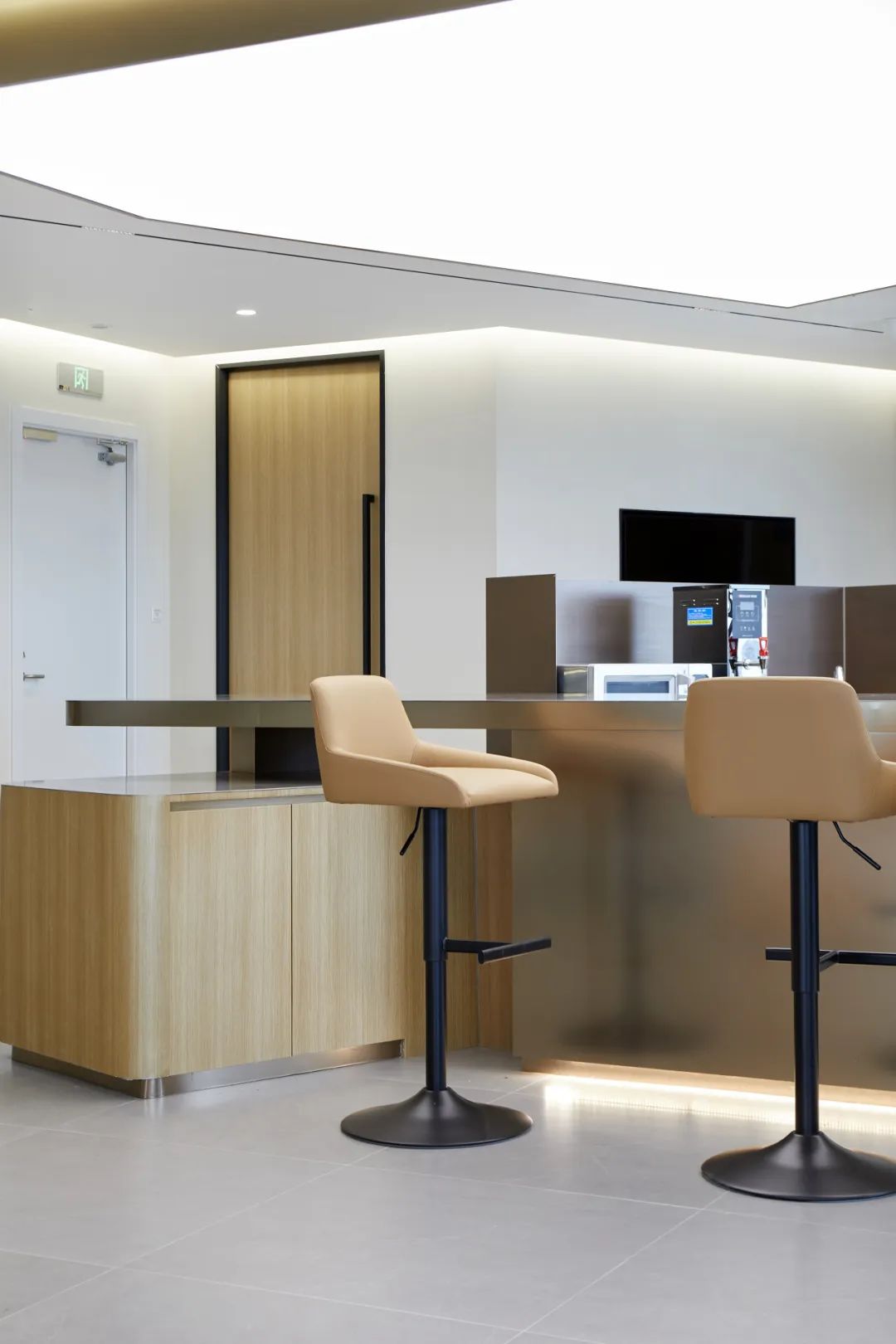 As the first sight for customers entering the space, the furniture configuration in the front desk reception area becomes the key to conveying the brand's temperament. The HTD team has abandoned the traditional intermediary agency's cold marble countertop design and customized a reception combination system that combines walnut veneer and light gray fabric: the main reception desk is 6.8 meters long and adopts a 120 degree curved design to eliminate physical barriers. The thickness of the countertop is precisely controlled at 45 millimeters to maintain a sense of lightness, and the suspended structure below is matched with warm white light strips to create a visual image of "welcome embrace".
