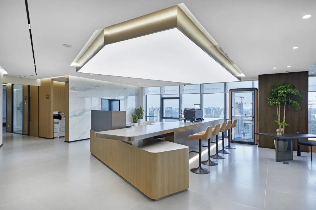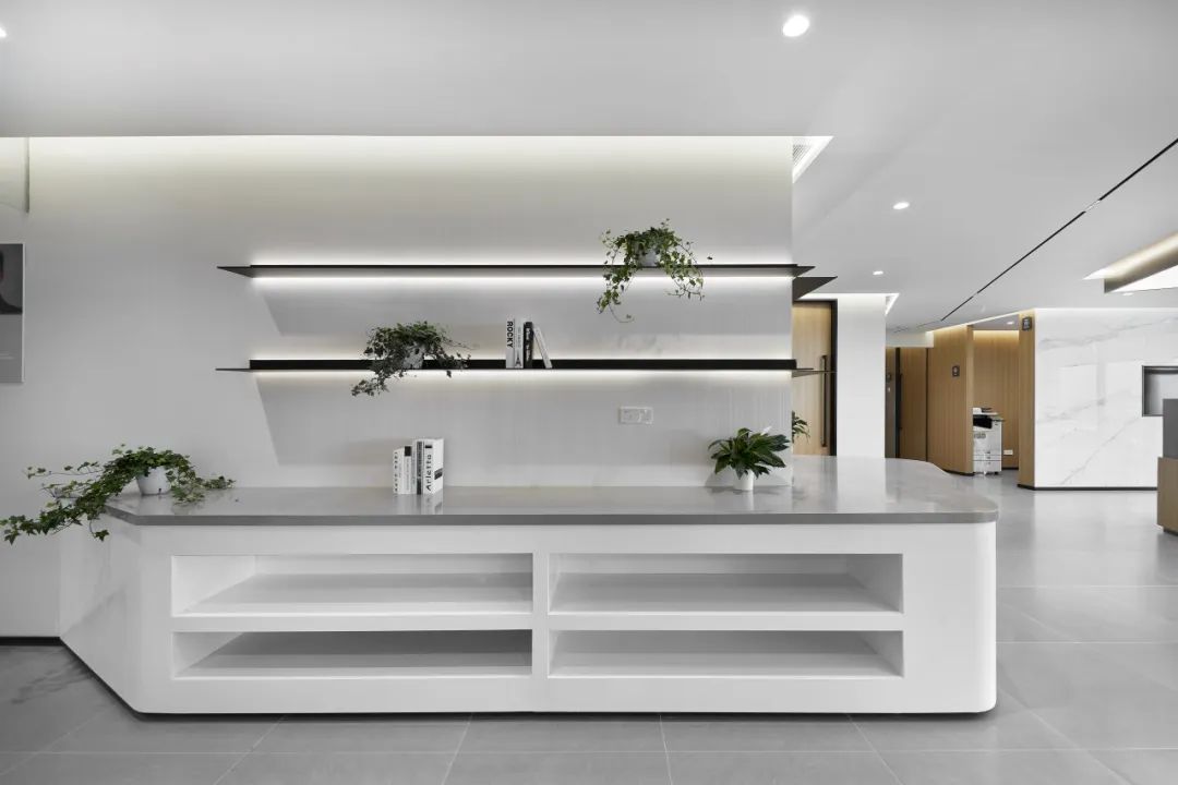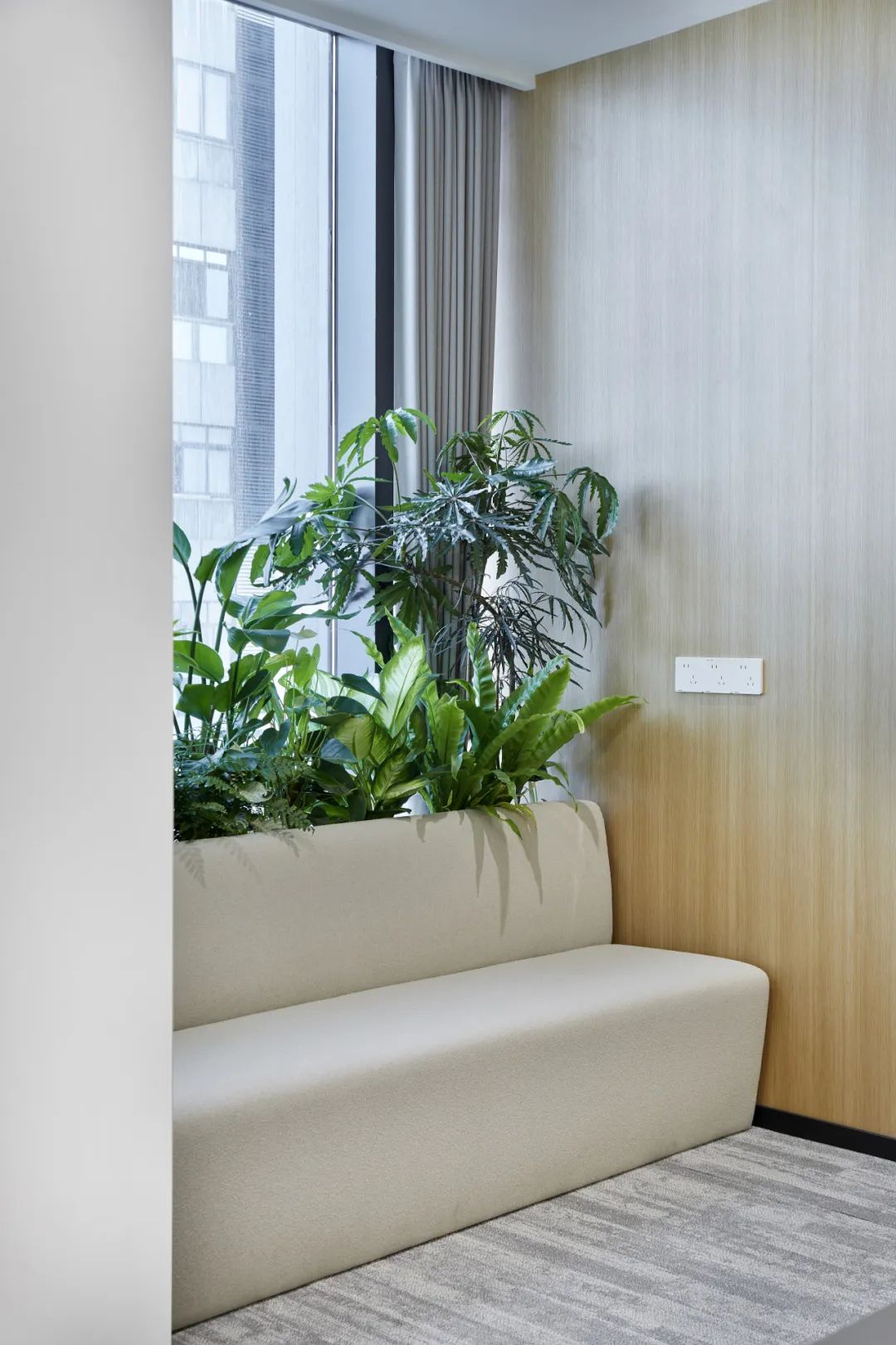 The background wall behind the reception desk hides a mystery - it is composed of 32 independently adjustable angle wooden modules, each with a built-in micro motor that can automatically adjust the tilt angle according to the natural light at different times, ensuring that the wall always presents a soft diffuse reflection effect. This dynamic furniture system perfectly complements other customized elements in the front desk area: the three person sofa in the waiting area features a detachable armrest design that can be pulled open to become a temporary negotiation table; The integrated customization of the green plant flower rack and storage platform in the corner of the wall, and the embedded design of the flower pot to avoid water leakage problems, together create a professional and friendly first impression.