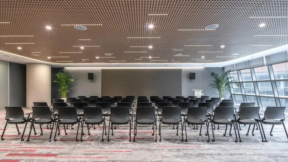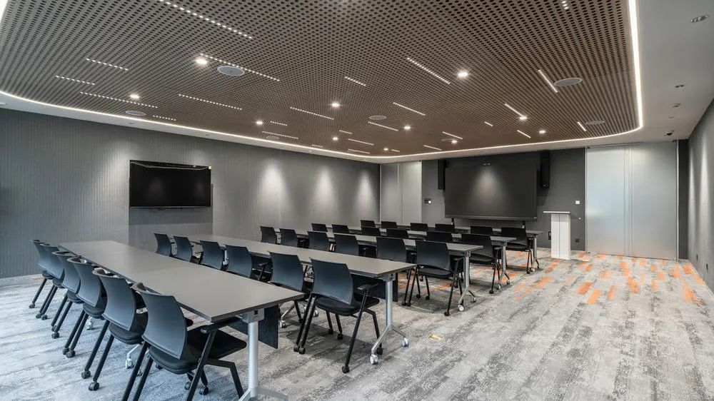 The interior of the conference room is hosting a 'customized furniture technology show'. The perforated ceramic aluminum ceiling is the biggest highlight, with a 2.3mm aperture that accurately calculates the acoustic reflection angle, and embedded LED light strips that simulate the trajectory of natural light changes. The data shows that this design controls the reverberation time of the conference room at 0.8 seconds, far below the industry standard of 1.2 seconds, while the lighting comfort rating reaches 92 points. What's even better is the diversified conference furniture configuration: from a 12 person oval table to a 4-person standing negotiation table, and even a specially customized "brainstorming sofa group", meeting the needs of all scenarios from board meetings to impromptu discussions.