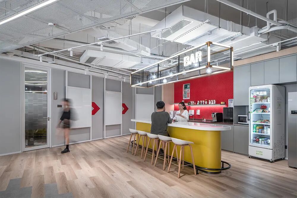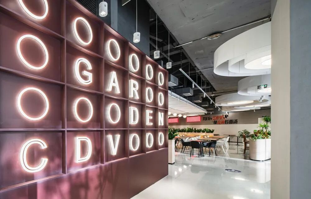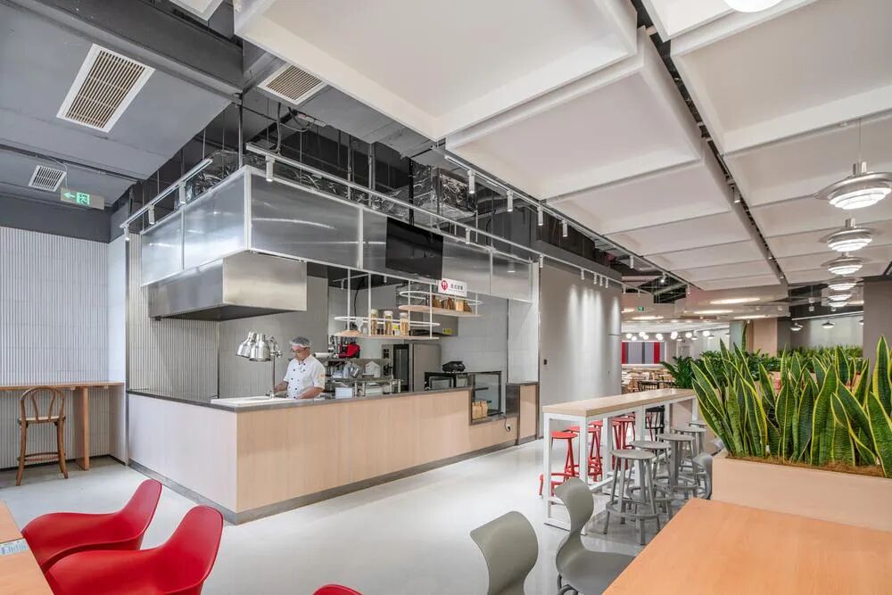 Who would have thought that the most popular check-in spot in the 23000 square meter headquarters would be hidden on the basement level? The staff restaurant at Vanke Southwest headquarters has used design magic to eliminate the oppressive feeling of underground space. The natural light introduced by the courtyard interweaves with circular chandeliers, complemented by warm yellow light strips, making people feel like they are in a night market on the streets of Chengdu. The customized long dining table imitates the layout of street vendors, while the hand-painted ceramic tiles on the walls replicate the fireworks atmosphere of old-fashioned restaurants.