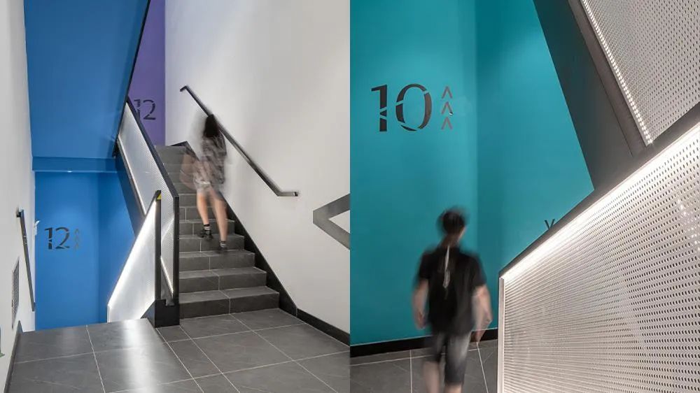 At Vanke's Southwest headquarters, even the evacuation stairwell has become a stage for design. The gradient treatment of cold and warm tones turns the originally monotonous passage into an art gallery, and the color themes of each floor correspond to the functional attributes of the corresponding floor: the office floor uses a calm blue, the conference floor uses a warm orange, and the employee activity area uses a vibrant green. This design not only enhances the recognition of the space, but also unexpectedly increases the utilization rate of the stairs by 40%, indirectly promoting the daily exercise of employees.