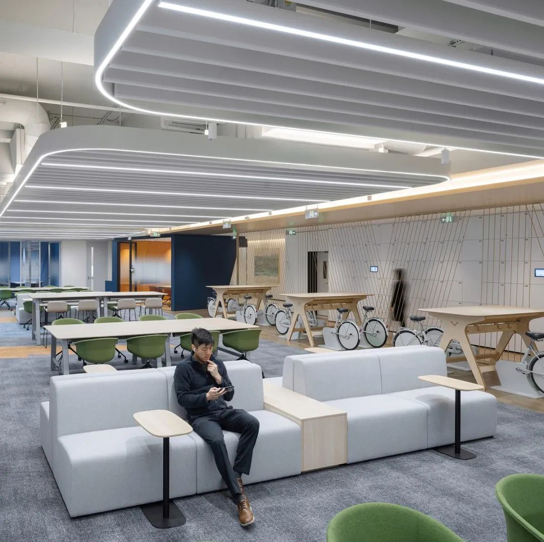 KAMPUS's gym and spinning bike room incorporate health concepts into the design of the office environment. Professional fitness equipment and customized exercise spaces complement each other, with the design of the spinning bike room being particularly eye-catching: a large screen combined with an immersive lighting system creates a dreamy sports atmosphere. The selection of office furniture (sports equipment) here not only focuses on professionalism, but also considers the user's experience. Even those who do not like sports cannot help but want to experience it. This approach of incorporating healthy spaces into the overall office environment planning reflects KPMG's comprehensive focus on employee well-being.