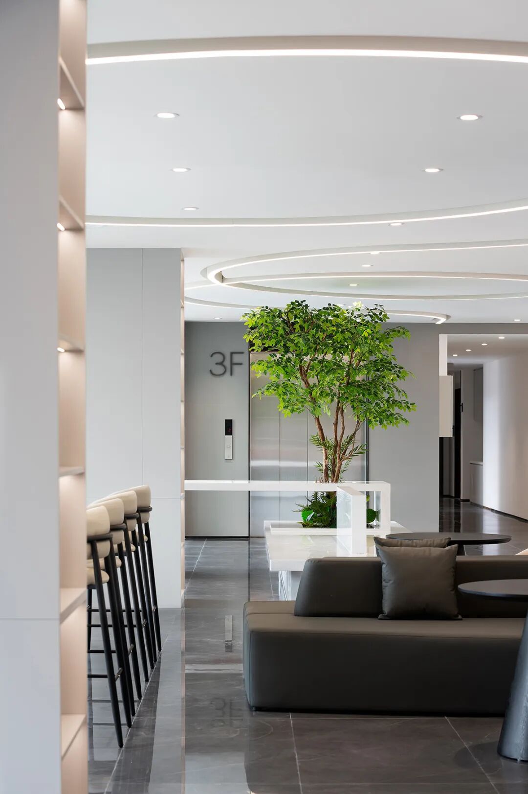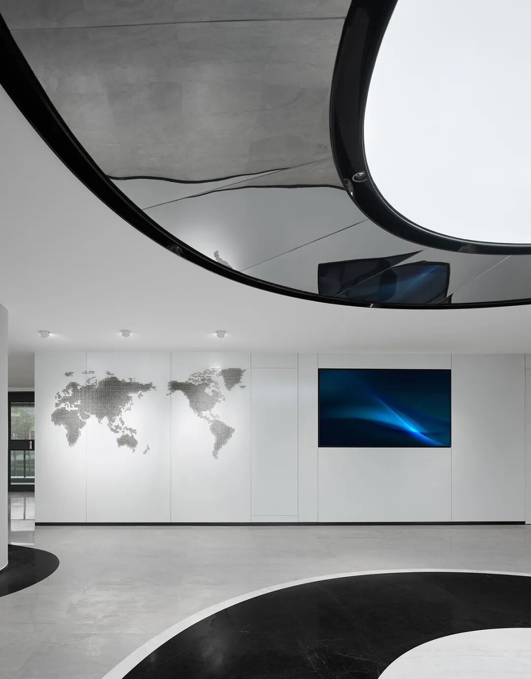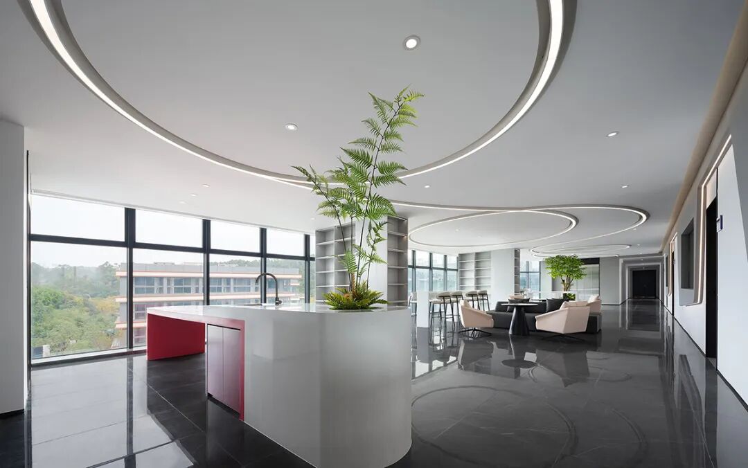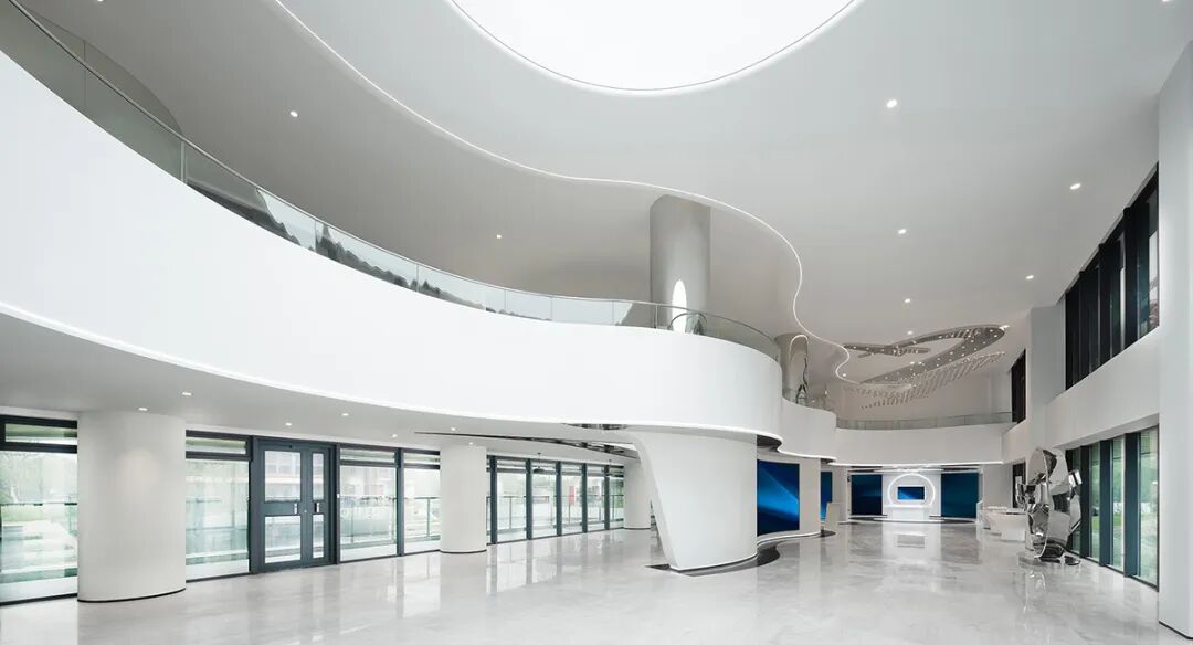 Entering the reception hall of the Xingchang Petrochemical R&D Center in Yueyang, the first thing that catches the eye is the design based on water ripples, cleverly integrating "the movement, stillness, joy, and shape of water" into the indoor space. The entire space is presented in the form of ribbons, outlining the grand and elegant beauty of the reception hall. The flowing curve symbolizing vastness extends from the reception area to the ground in a scroll shape, growing out of the space as if it has vitality, interspersed throughout the entire hall.