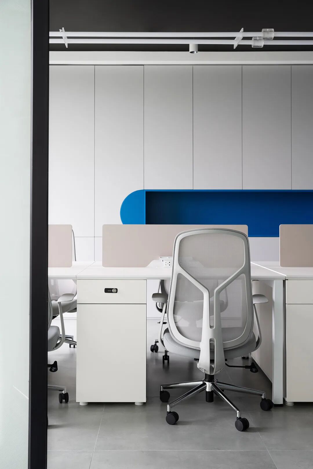 The open office area adopts a modular office furniture system, and each desk can be flexibly combined according to team needs. The desktop is made of E0 grade environmentally friendly board, and the edges are sealed with soft PVC, which ensures durability and increases comfort during use. The table is equipped with hidden cable trays and adjustable foot pedals, fully considering the usage habits of office staff. The office chair is designed with ergonomic mesh fabric, and the backrest and seat cushion are made of high elastic mesh fabric, which is both breathable and provides good support.