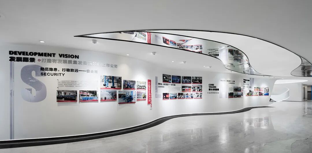As a composite space connecting the hall and exhibition hall, the "water ribbon" design element has been further extended and sublimated here, connecting various scene spaces and becoming a medium that connects space, time, and emotion. The entire exhibition hall creates an atmosphere of future technology, allowing visitors to feel the pulse of the technological era from the moment they step into the exhibition hall.
