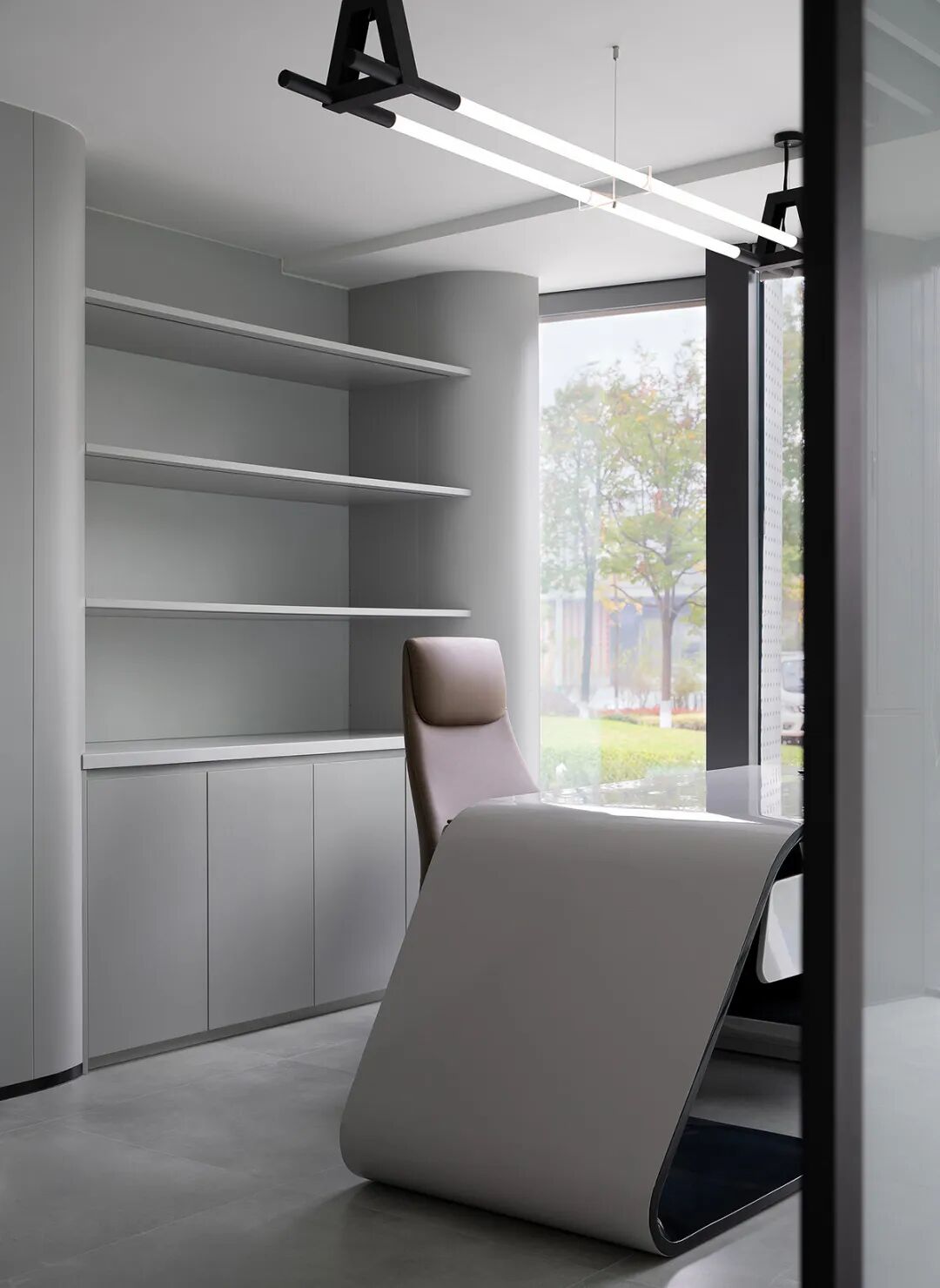 As an expert level independent office, the design pursues a calm and tasteful atmosphere. The combination of deep gray calmness, white purity, and black sophistication creates a unique sense of stability. The interior is equipped with customized solid wood office desks, made of high-quality walnut wood. The tabletop is polished through multiple processes to present a warm and glossy appearance. A set of embedded bookshelves is set up next to the office desk, which not only saves space but also provides sufficient storage function. The office is also equipped with a small conference sofa made of high-quality leather, providing a comfortable place for temporary small meetings.