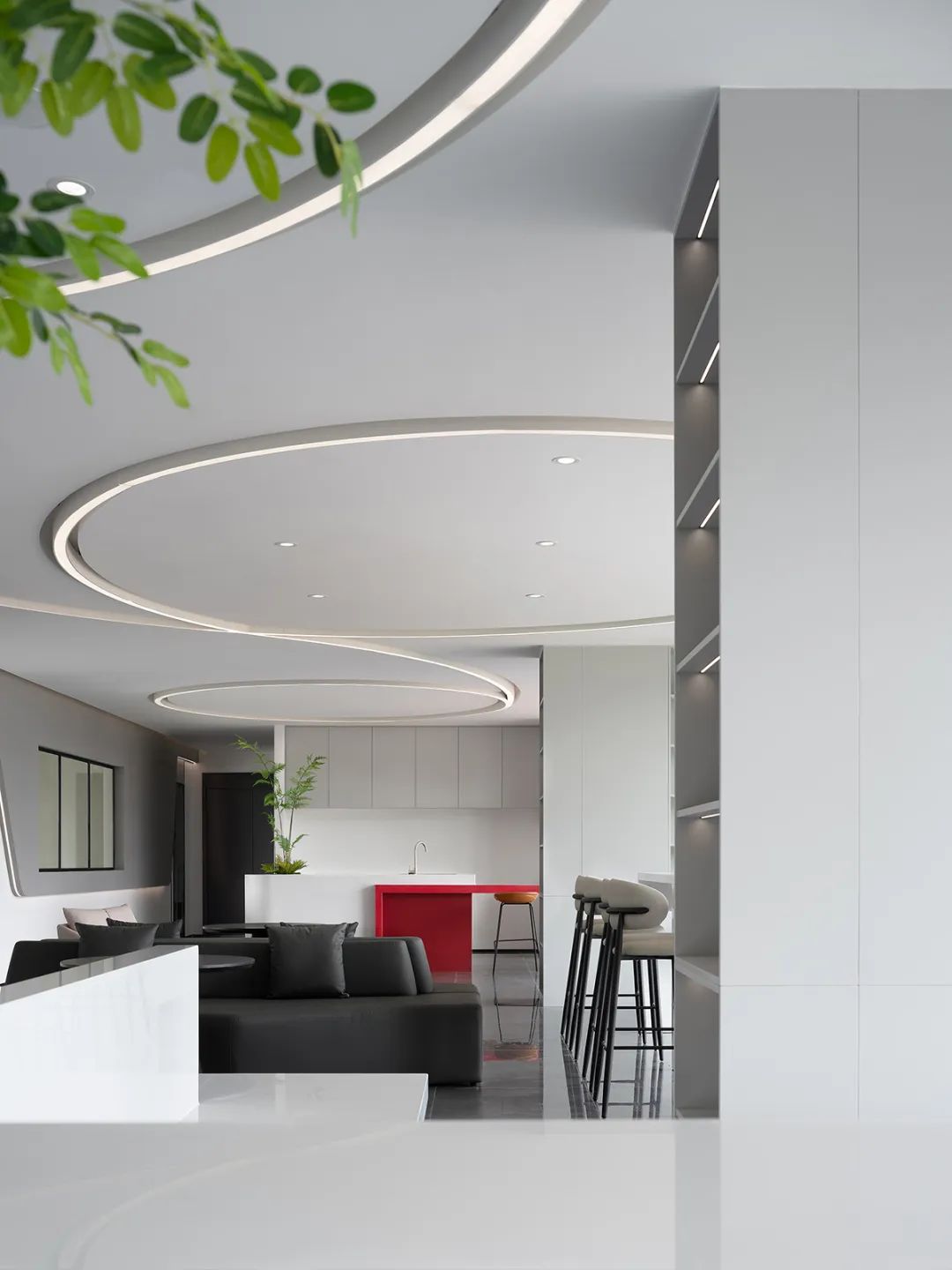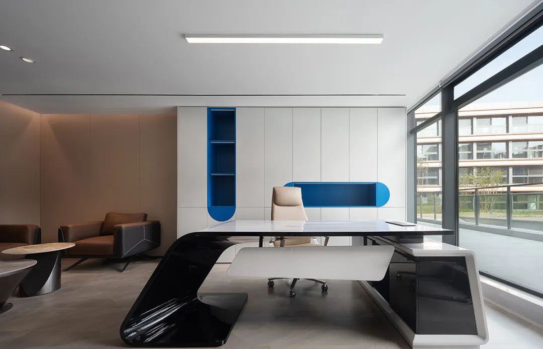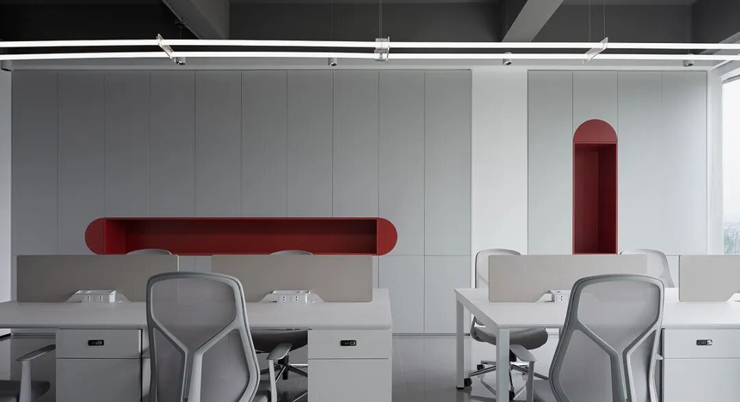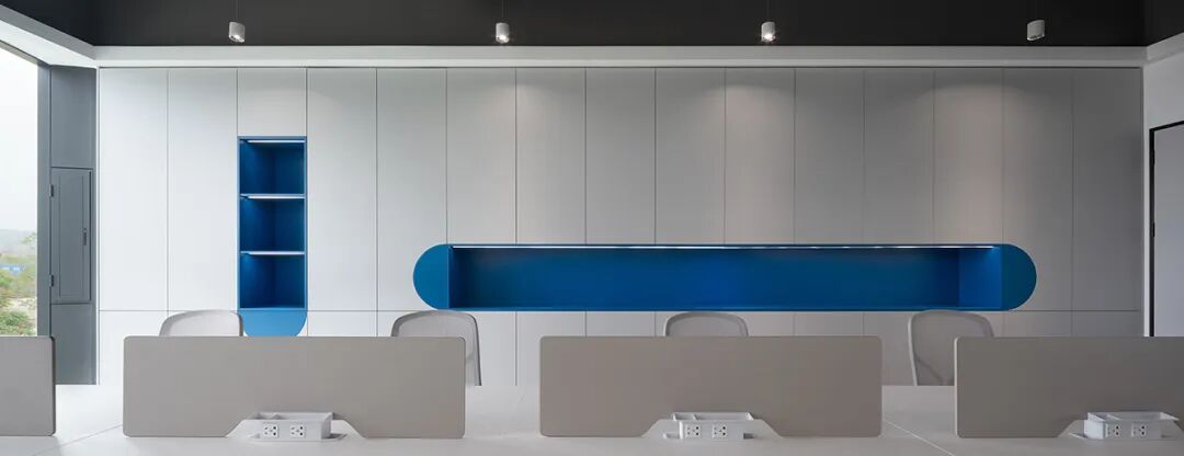 The design of the office area integrates modern office concepts and humanized elements, constructing clear spatial hierarchy through pure and efficient lines and large areas of white space. The jumping use of red and blue colors emphasizes the depth of space to the extreme, making seemingly undefined spaces contain diversity and vitality.