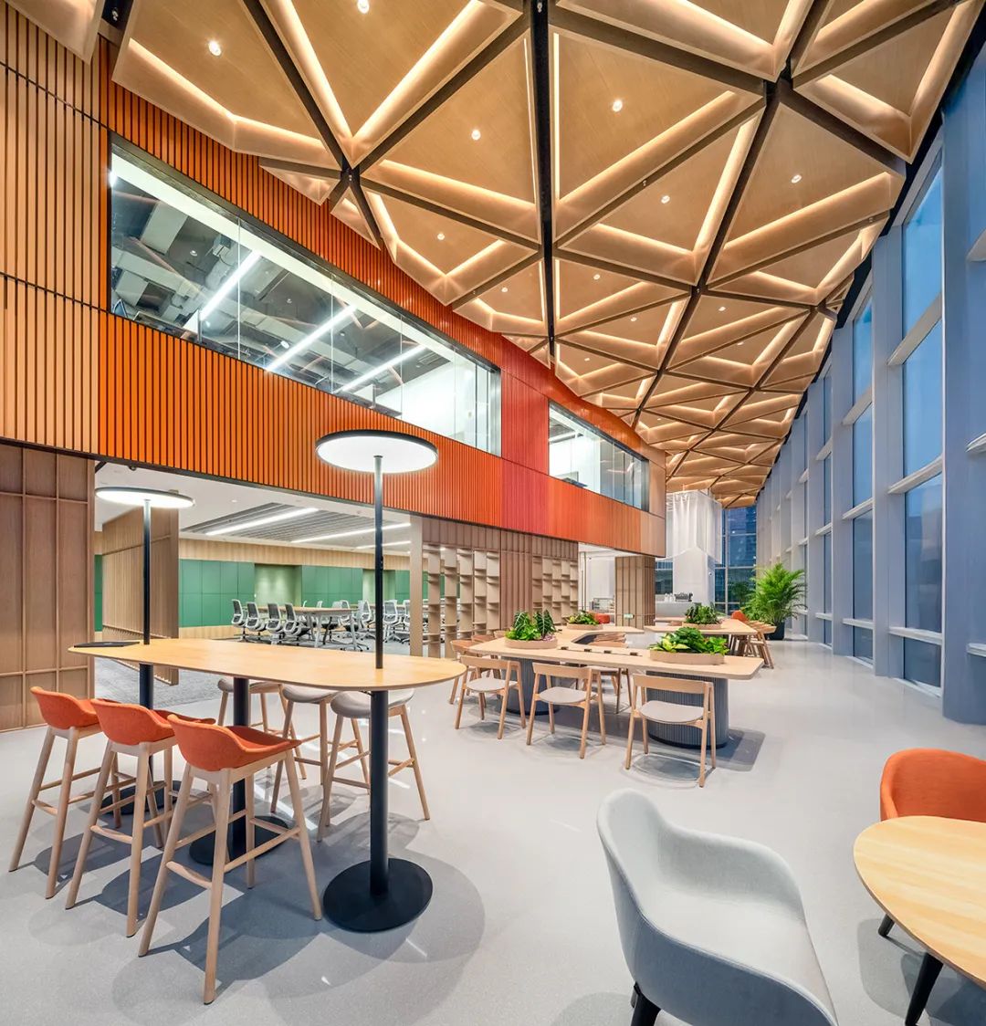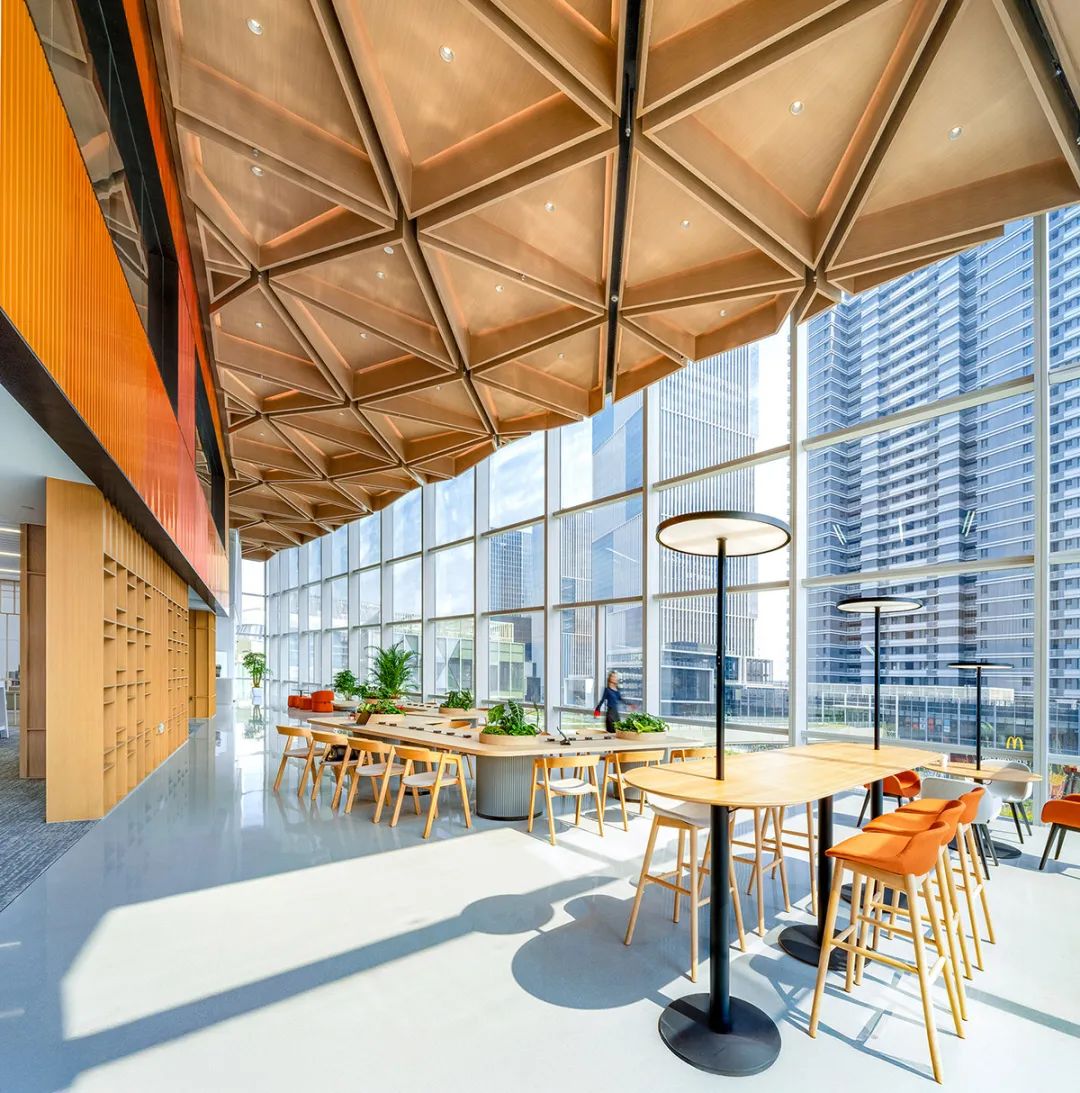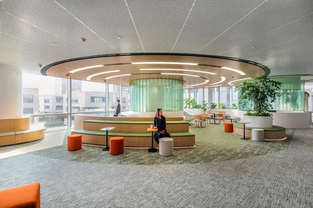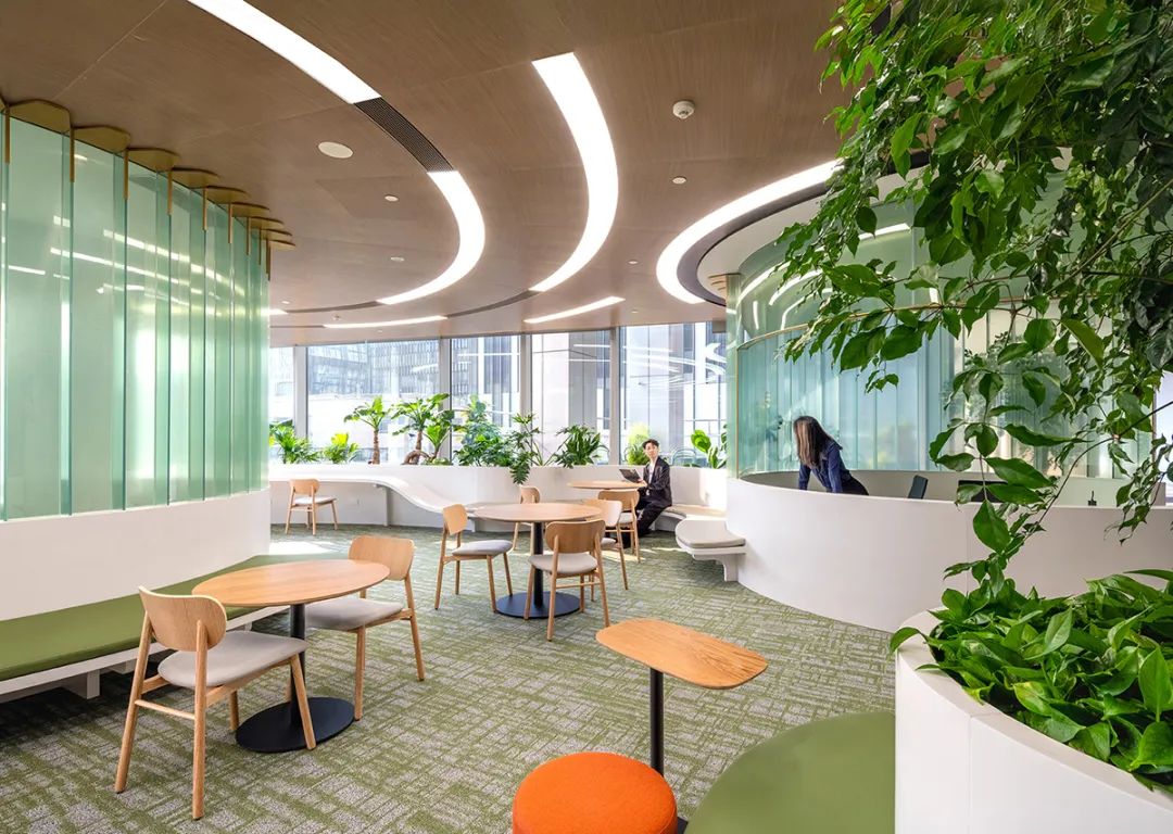 Taking inspiration from natural elements such as mountains, valleys, and gardens, incorporating green plants and curved layouts, we create a "natural oxygen bar" style office environment in Shanghai, blurring the boundaries between work and rest.