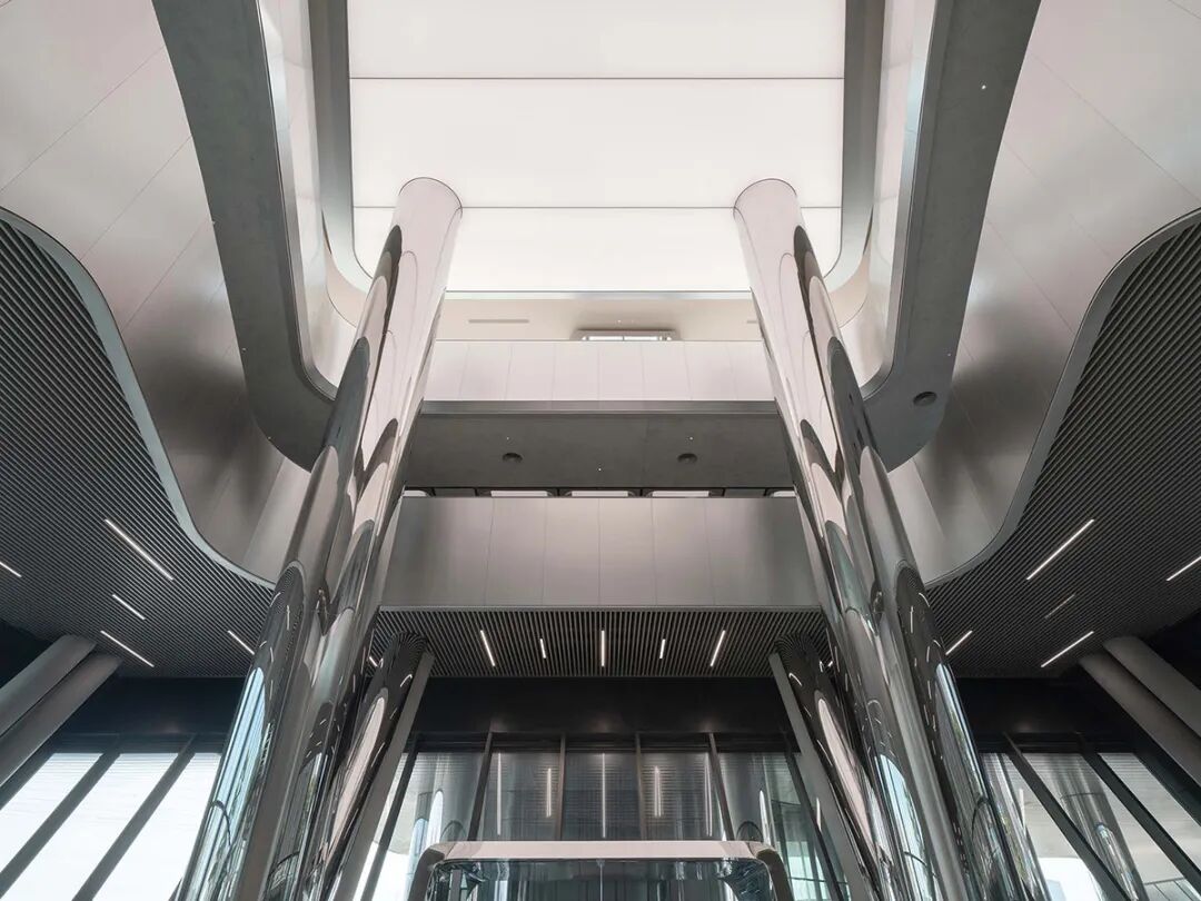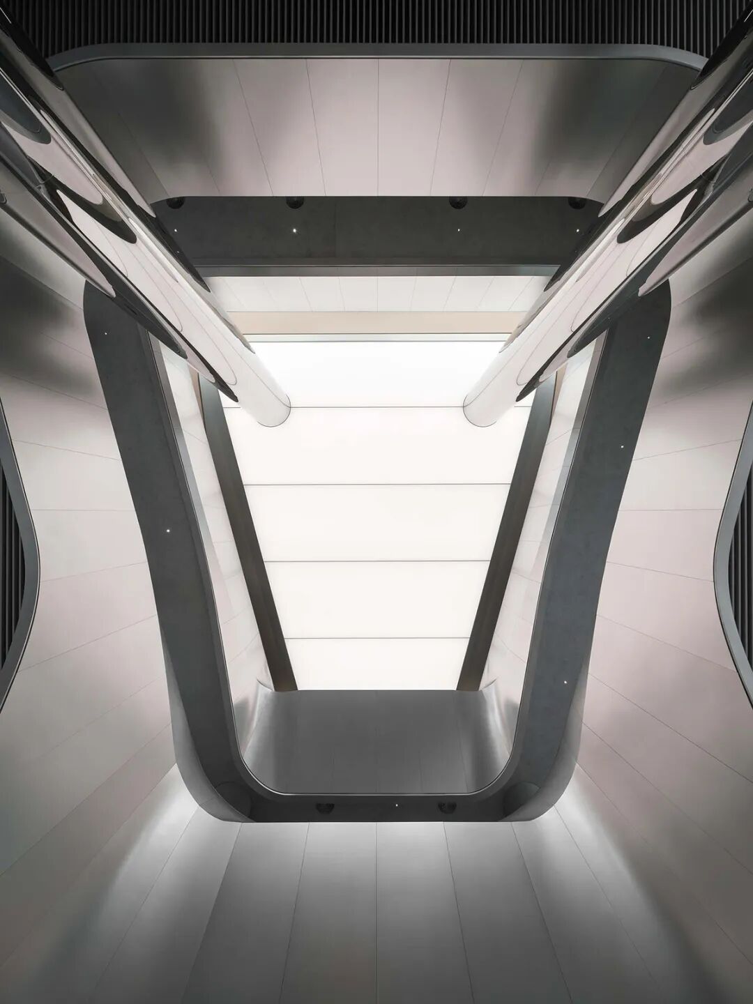 Entering the empty lobby, the traditional spatial order is completely overturned. The continuous irregular stainless steel connects the entire space like an interstellar medium, and the inclined curtain wall cuts a visual dimension between reality and fantasy. The most stunning cantilevered staircase is not only a functional connecting link, but also a dynamic sculpture at the center of the space - as you climb up the stairs, the hollow areas cut light and shadow into flowing galaxies like spaceship portholes, making every step a metaphor for interstellar roaming.