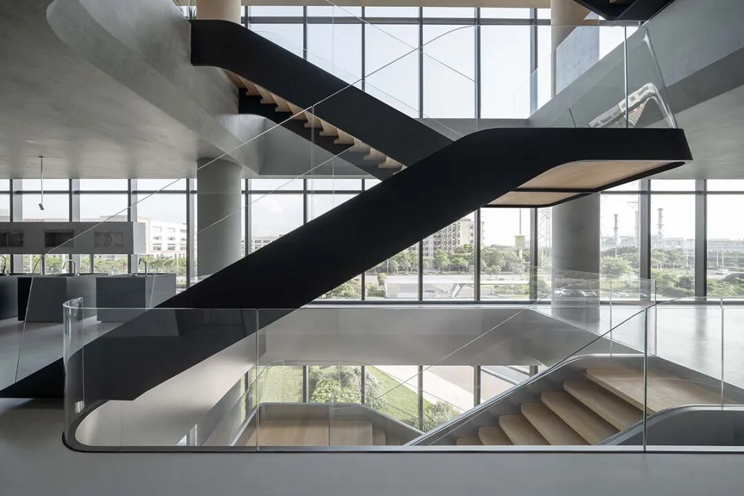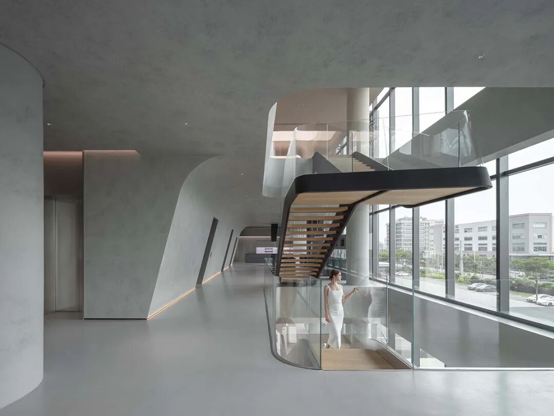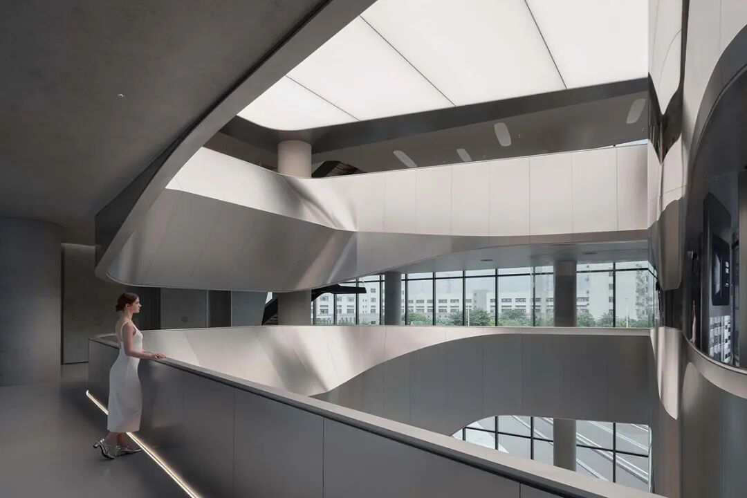 Keywords: artistic sense, hardware manufacturing/exhibition hall, office environment, Foshan, headquarters, futuristic sense, visual art, atrium, cantilevered stairs, application of stainless steel, commercial space