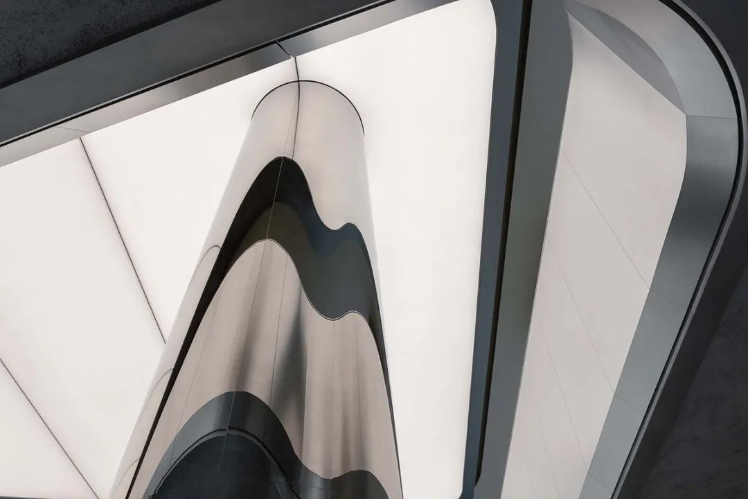 The water ripple embossed stainless steel ceiling of Tokyo Isetan Watch Store provides a subtle footnote to material aesthetics - six 948mm × 600mm movable panels reflect flowing light spots under sunlight through precision embossing technology, like solidified morning mist on the Huangpu River. This technology has been further developed by the irregular curtain wall of the Hangao Interstellar Headquarters. Through parametric design, each piece of stainless steel has a unique ripple angle, presenting a gradient spectrum from silver white to indigo as the sunlight angle changes.