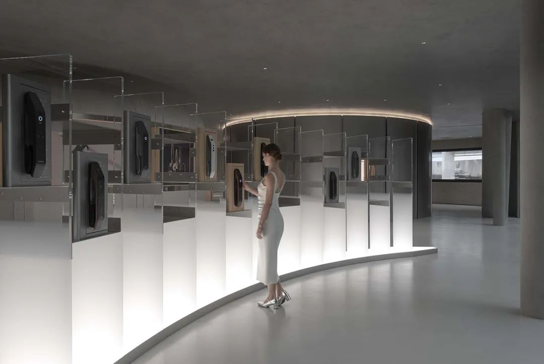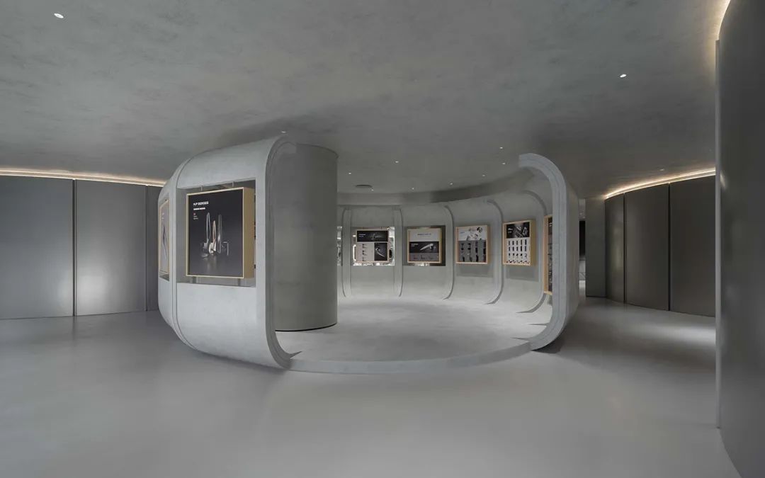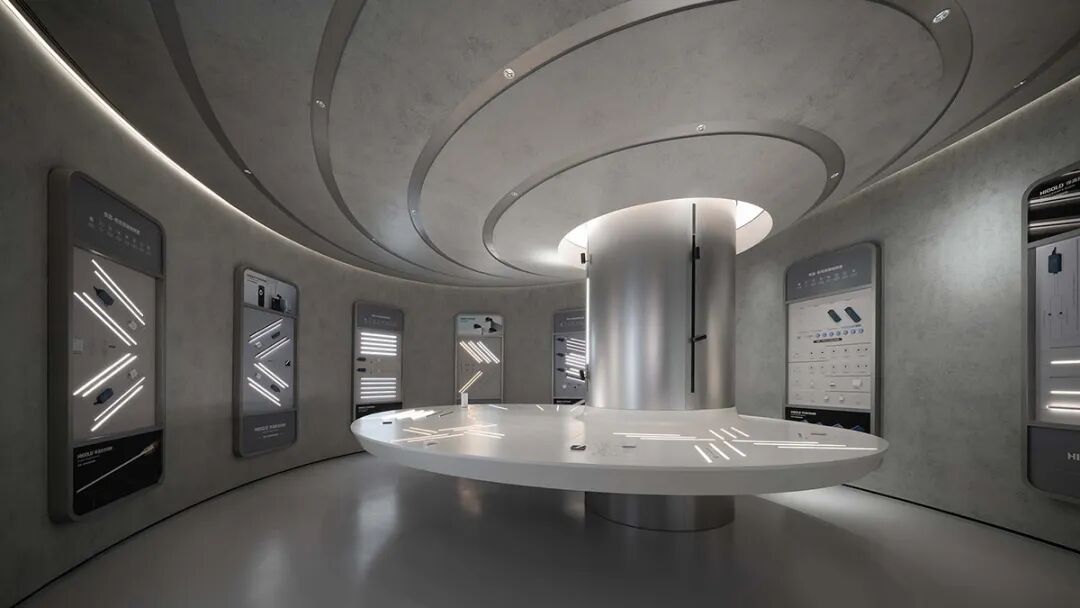 Stainless steel has undergone a transformation from an industrial material to an artistic language here. The wall is treated with 304 stainless steel satin brushed finish (mesh size 400 #) to create a delicate silk texture; The display cabinet countertop is made of 8K mirror stainless steel (316 material), with reflections interwoven with the real and virtual objects; Customized furniture is cut with a water jet and laser welded to etch geometric patterns with a precision of 0.2mm onto 304 stainless steel. The triangular stainless steel wardrobe challenges daily order with sharp geometry, and the folding design creates a visual maze that intertwines time and space; The circular device creates a dimensionless field in the atrium, with paths of different curvatures guiding visitors to explore the symbiotic relationship between hardware products and spatial art. Even the unavoidable structural columns have been transformed into functional and sculptural entities, sometimes hidden in the background and sometimes becoming the protagonists of spatial narrative.