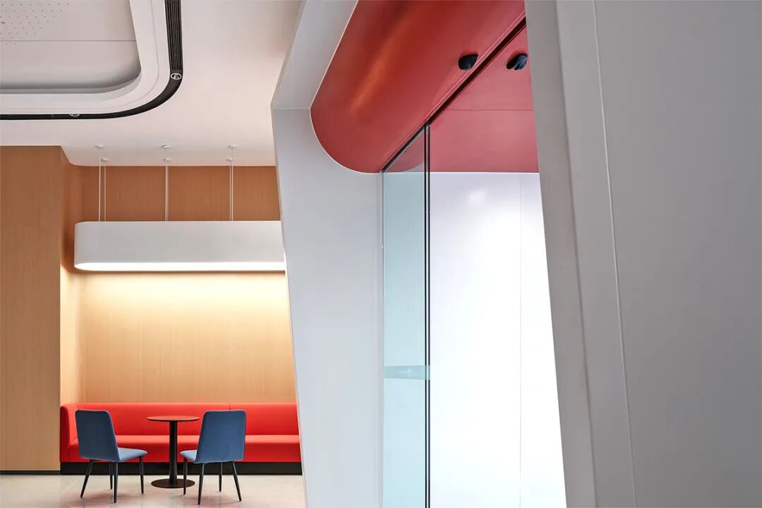 转过前台进入等候区,办公环境的温度感开始显现。设计师摒弃了常规的金属座椅,定制了一组中国红布艺沙发,15度倾斜的靠背角度经过人体工学测算,配合3厘米厚的高密度海绵垫层,让等候不再是煎熬。沙发旁的原木边几采用FSC认证的白蜡木,与极简的白色吸顶灯形成材质碰撞,这种"科技冷感"与"自然温度"的平衡,恰是华为海思"开放包容"理念的空间转译。