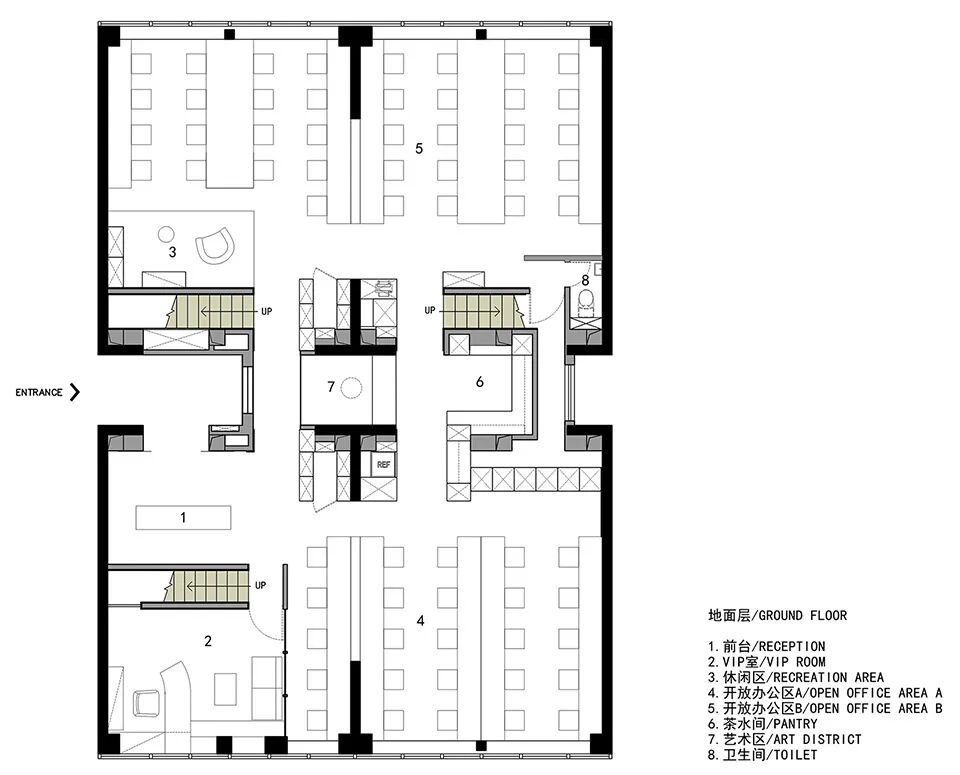 一层动线围绕中区形成洄游路径,两座可反复穿行的走廊增强了空间流动性。素净白墙与温润木材质感对比,配合精心设计的办公家具,让员工在开放与私密间自如切换。开放式办公区的模块化家具布局使团队协作效率提升30%,独立新风系统的加入,更确保了办公环境的舒适度与健康标准。