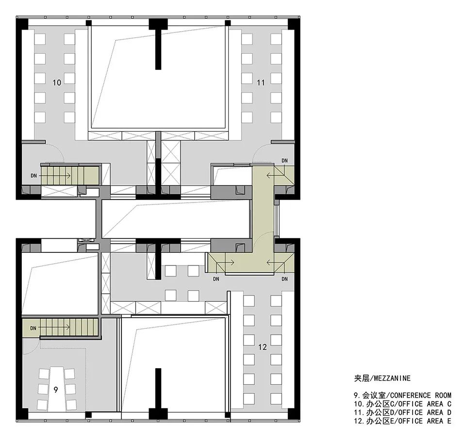 面对原建筑屋梁低、柱体多的局限,设计团队反其道而行。他们利用4.28米层高优势,嵌套夹层并设置三座楼梯连接四间功能房,通过"内建筑"手法实现空间增容。这种重构不仅解决了拥挤问题,更创造出独立又开放的办公环境。