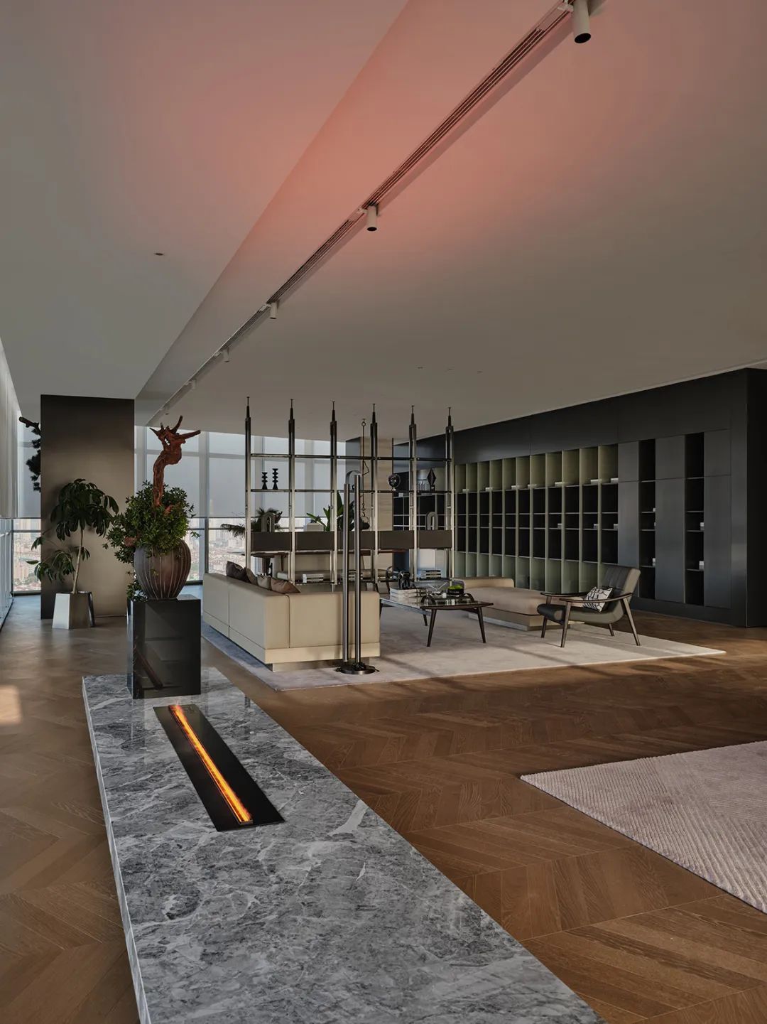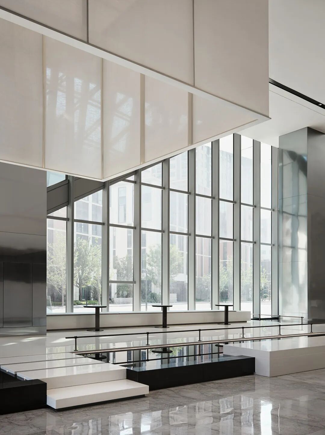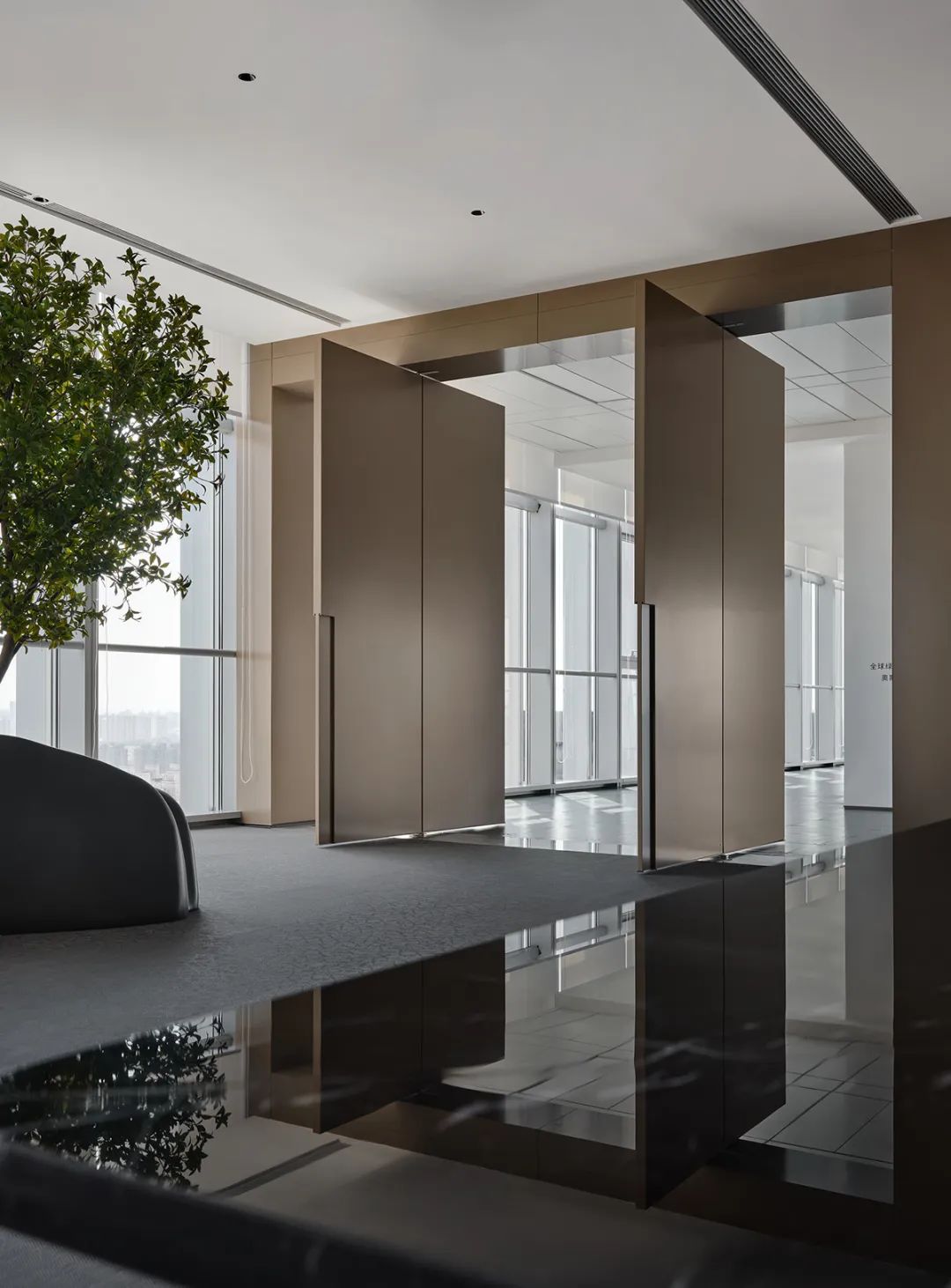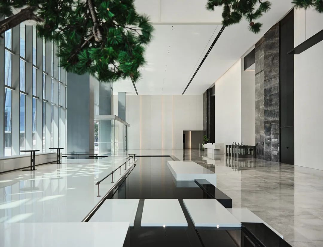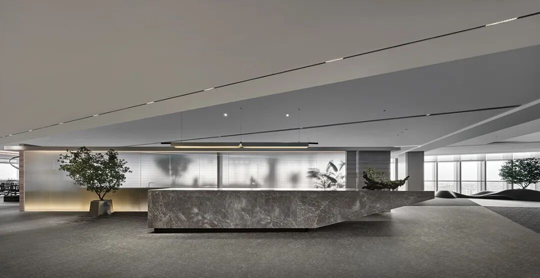 放弃传统大堂的密集工位布局,设计团队用“山水留白”的手法重构空间逻辑。意大利雾灰与白色水磨石如同宣纸底色,而办公家具则化身为墨画中的点睛之笔——园林汀步般的坐石临水而置,苍穹纱罩下的定制休闲椅复刻庭院坐席体验,123 平米室内水池边的弧形沙发组,将商务接待的正式感消解于“临水听风”的生活意境中。这些定制家具不再是孤立的功能物件,而是与“西侧造山、东侧落水”的室内造景法则深度咬合,在“水、木、天”的竖向层次中,构建出可坐、可停、可沉思的立体生活网络。