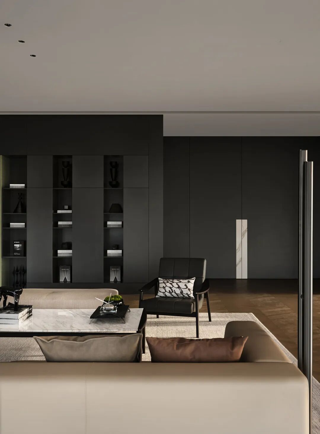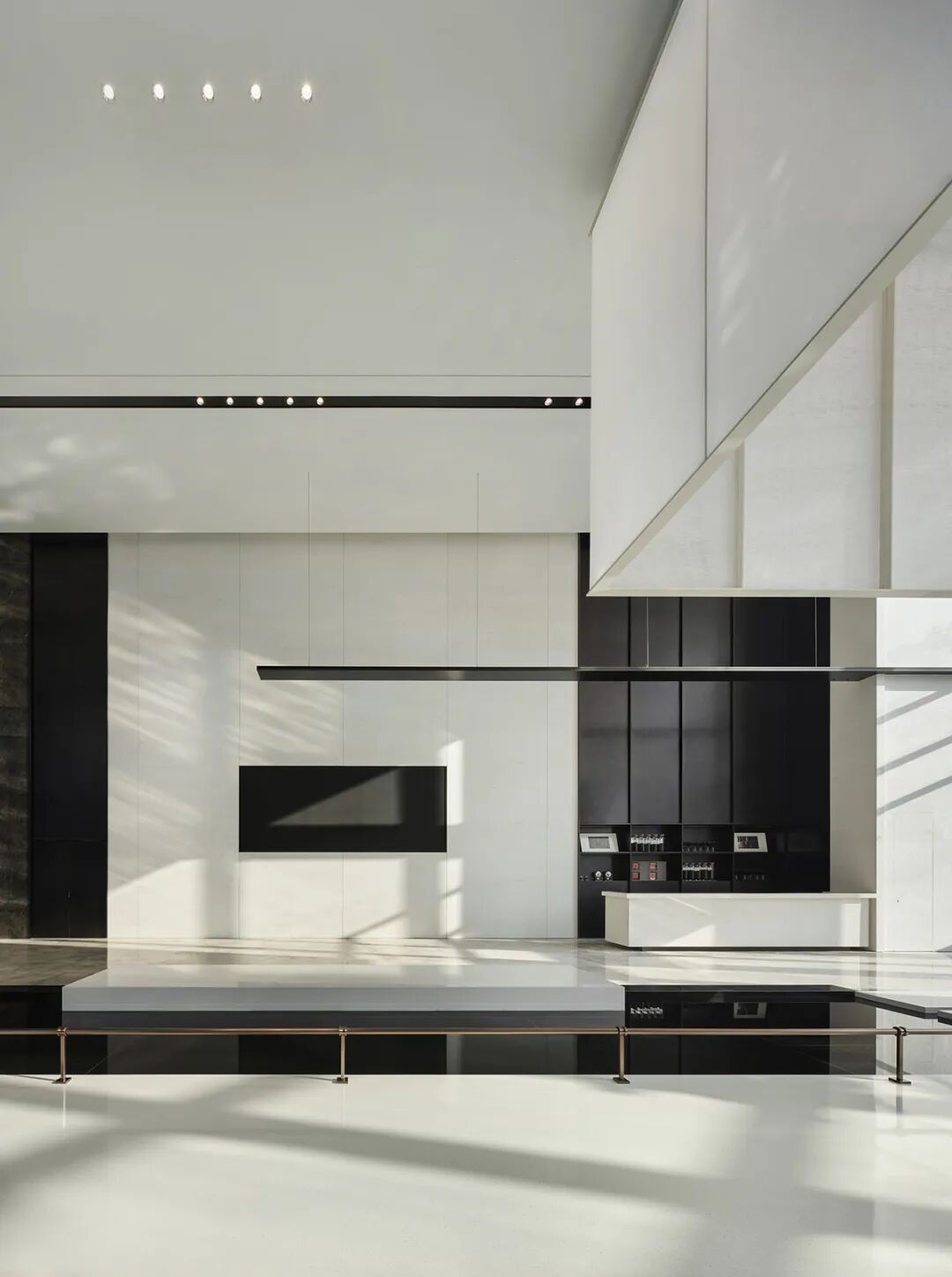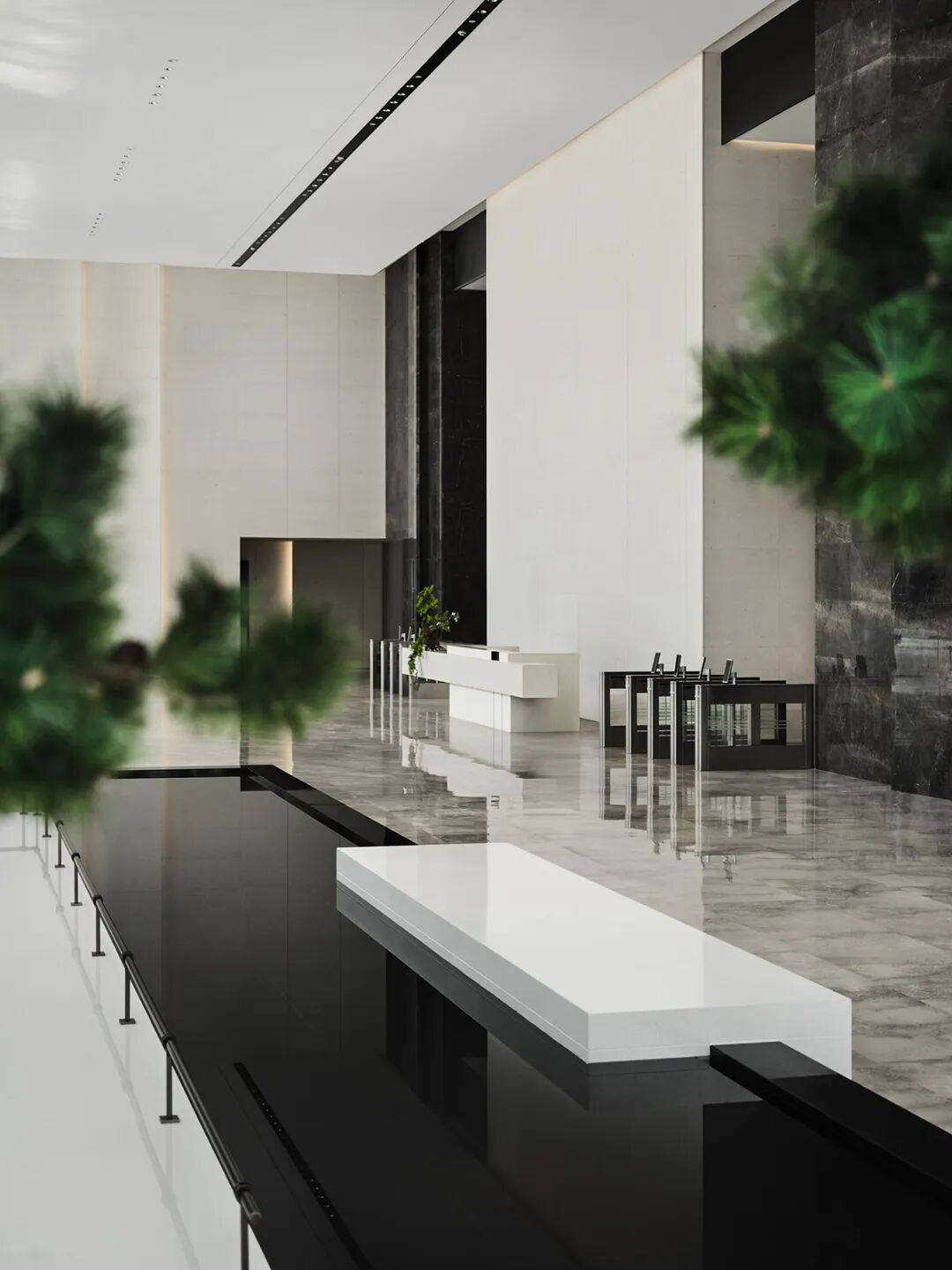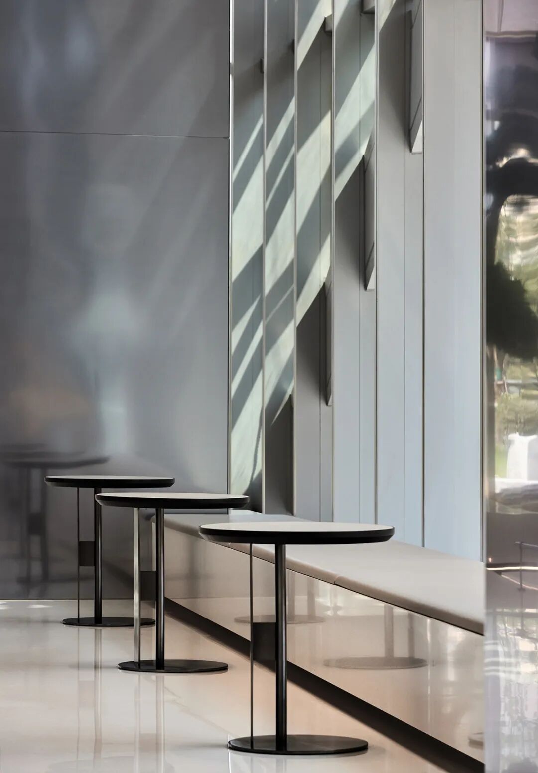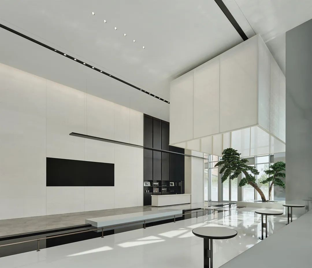 放弃传统大堂的密集工位布局,设计团队用“山水留白”的手法重构空间逻辑。意大利雾灰与白色水磨石如同宣纸底色,而办公家具则化身为墨画中的点睛之笔——园林汀步般的坐石临水而置,苍穹纱罩下的定制休闲椅复刻庭院坐席体验,123 平米室内水池边的弧形沙发组,将商务接待的正式感消解于“临水听风”的生活意境中。这些定制家具不再是孤立的功能物件,而是与“西侧造山、东侧落水”的室内造景法则深度咬合,在“水、木、天”的竖向层次中,构建出可坐、可停、可沉思的立体生活网络。