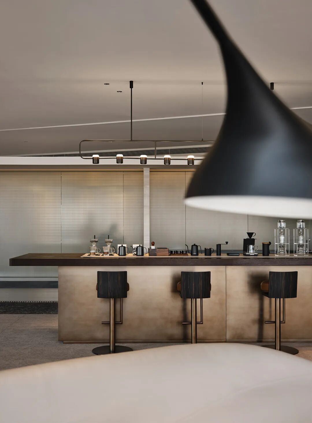 寸土寸金的上海,近 1000 平米的大堂如何摆脱传统商务空间的压迫感?YuQiang & Partners 的答案是:让办公环境向生活场景投降。设计团队将近一半大堂空间划入休闲范围,而定制家具正是这场空间革命的隐形骨架。