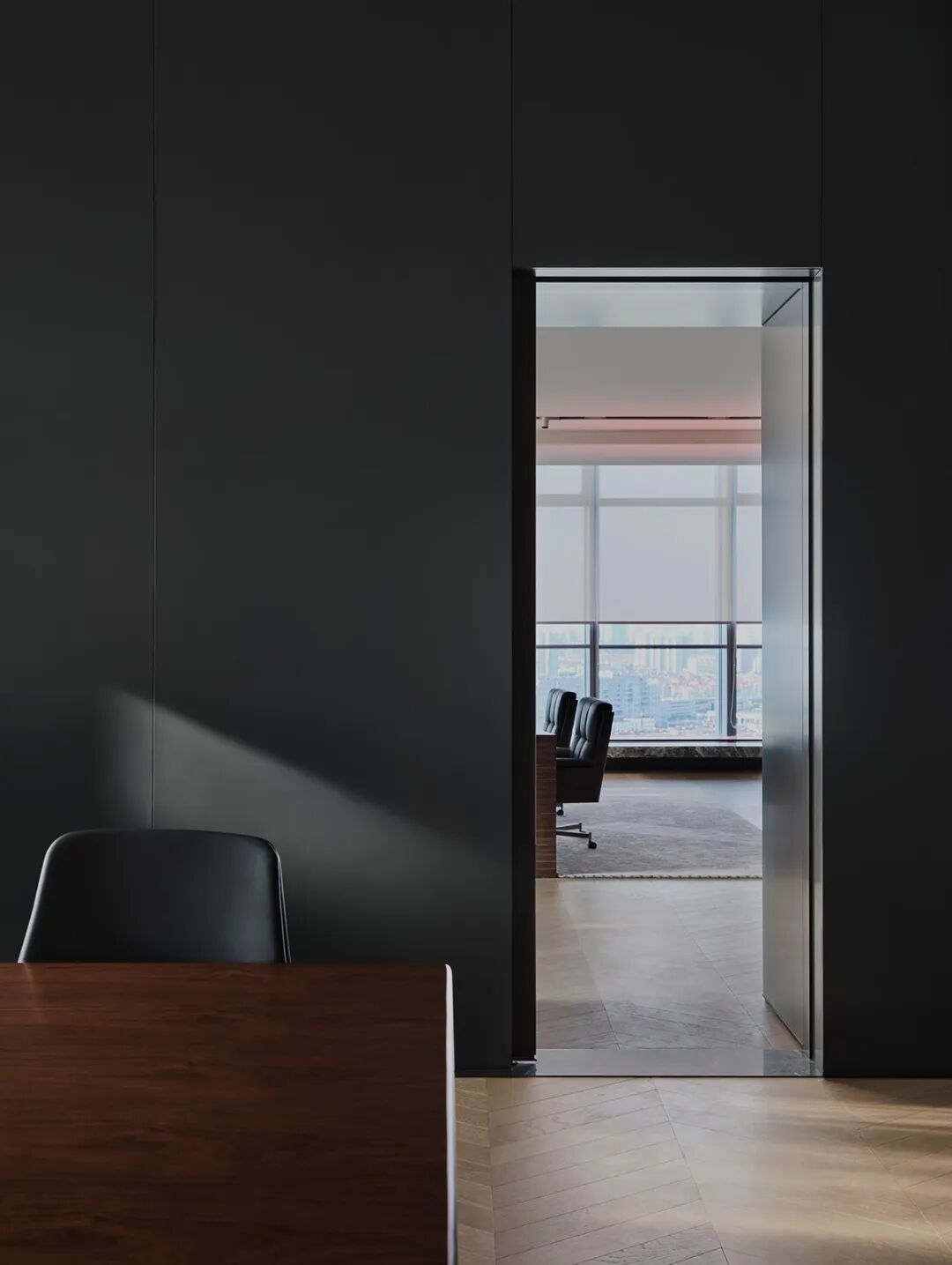 转入东侧“峡谷探险”区域,8 米向 4 米收口的空间里,定制家具展现出惊人的空间塑造力。半开放会议室的折叠玻璃墙与可收纳会议桌,在窄道空间中创造出“收放自如”的魔术效果;而“满载抵达”的私密办公区,深色系定制家具则铺陈出海派摩登感——2.4 米超长办公桌嵌入无线充电模块,隐藏式储物柜与墙面石材浑然一体,就连休闲会客区的单人沙发,其坐深与靠背角度都经过人体工学与东方坐姿的双重考量。
