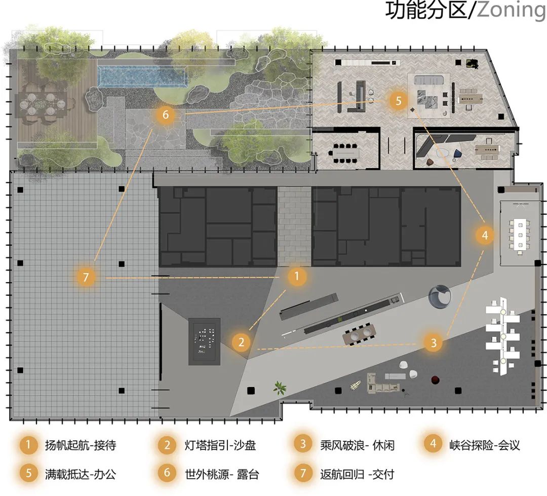 如果说大堂是“乐活商务”的诗意序章,那么 19 层 1652 平米的高空样板间则是办公环境的未来实验室。YuQiang & Partners 设计的“扬帆启航 - 世外桃源”动线叙事链中,定制家具成为空间故事的主要讲述者。