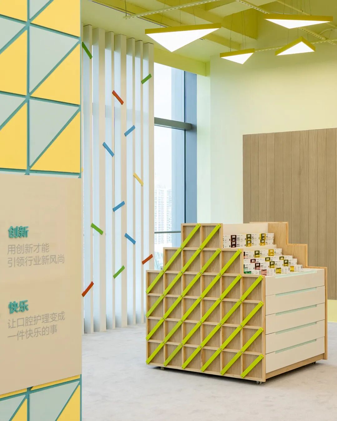 以浅黄与天蓝色为主色调,结合金属与木质材质,传递口腔护理行业的洁净感与科技感。