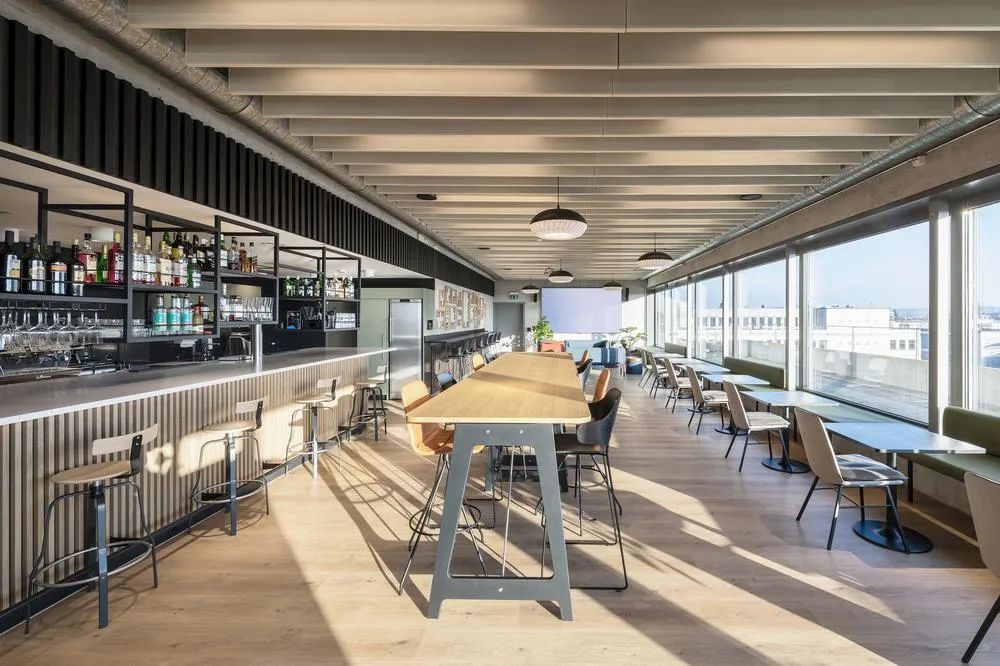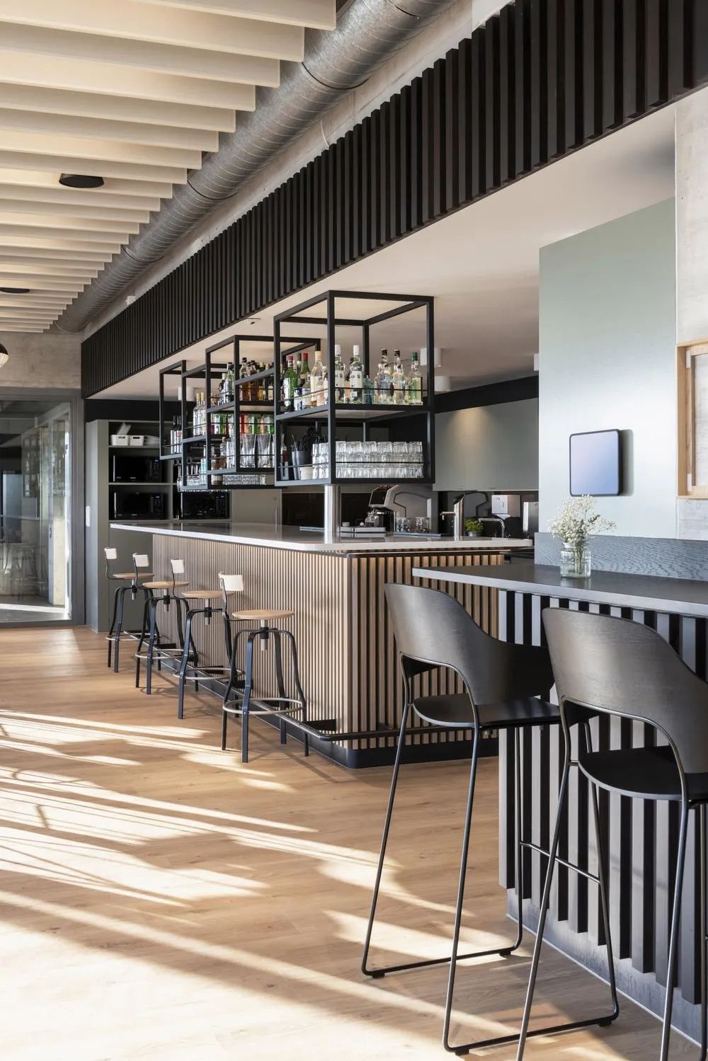 顶层社交中心:以浅色与深色木质元素、酒红色定制家具及啤酒龙头吧台,打造高端鸡尾酒般的舒适环境,满足员工与客户的休闲需求。