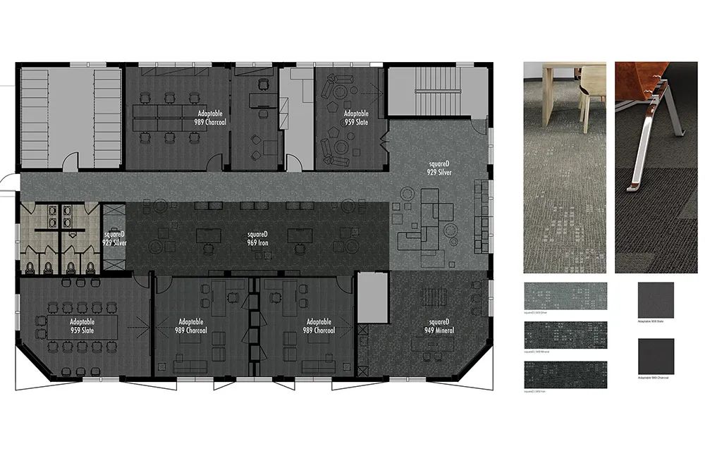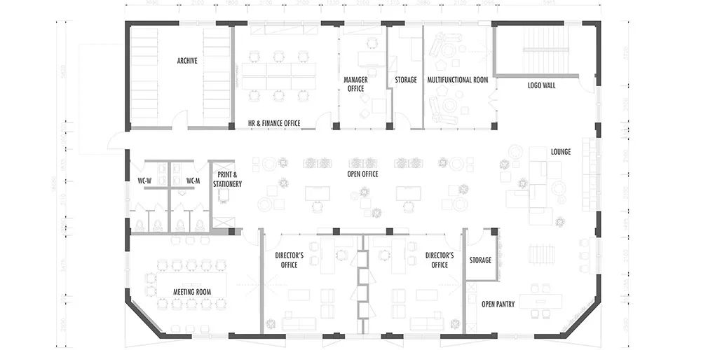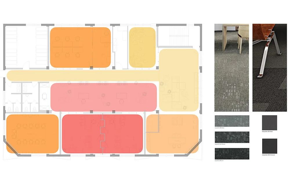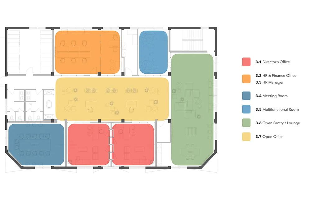 休闲会议区的组合式沙发更是暗藏玄机。看似随意摆放的模块沙发,实则按照“7 米社交距离”原则设计——每个沙发组之间相隔 7 米,既保证小组讨论的私密性,又不会阻断空间的视觉连通。而不同功能区的灰色方块地毯则用微妙的图案差异划分区域:条纹图案区适合专注工作,网格图案区鼓励即兴交流,这种“地毯语言”比指示牌更直观地引导着空间使用方式。