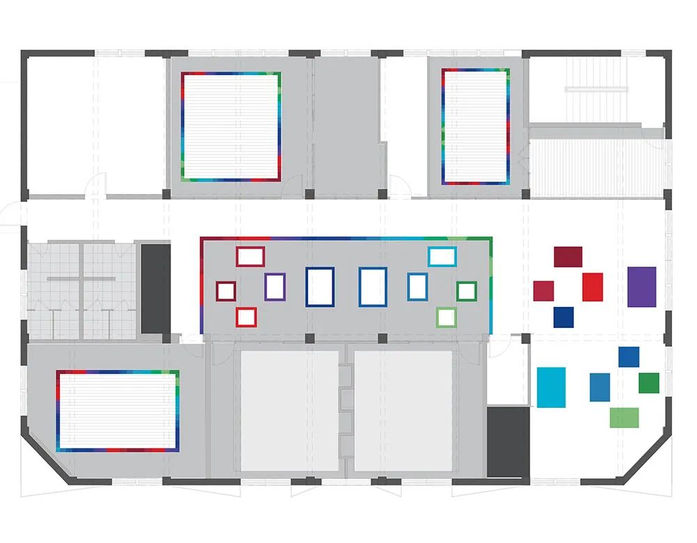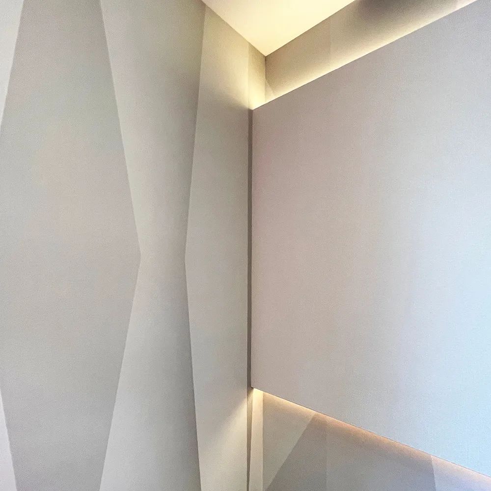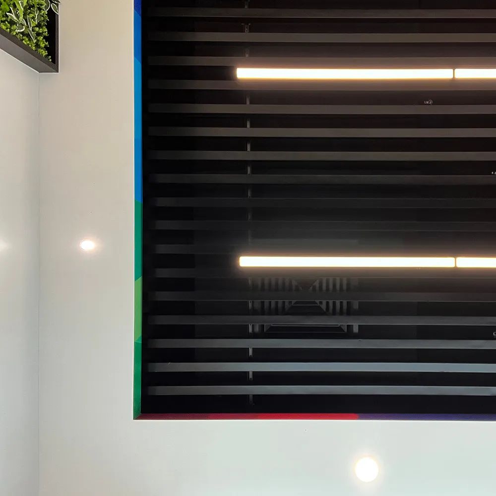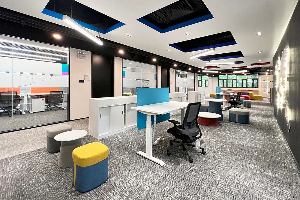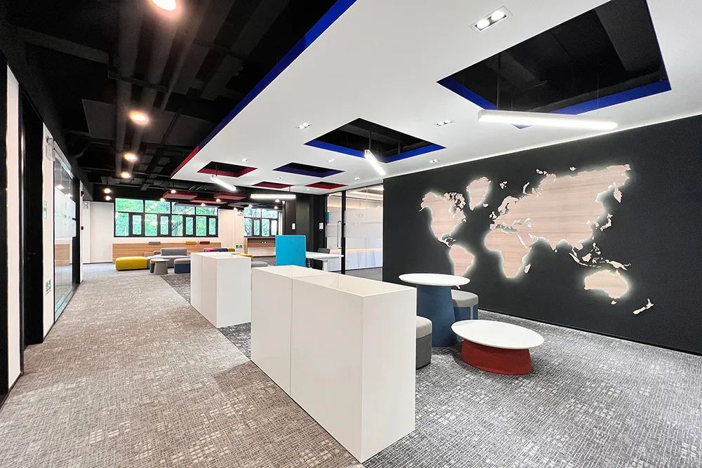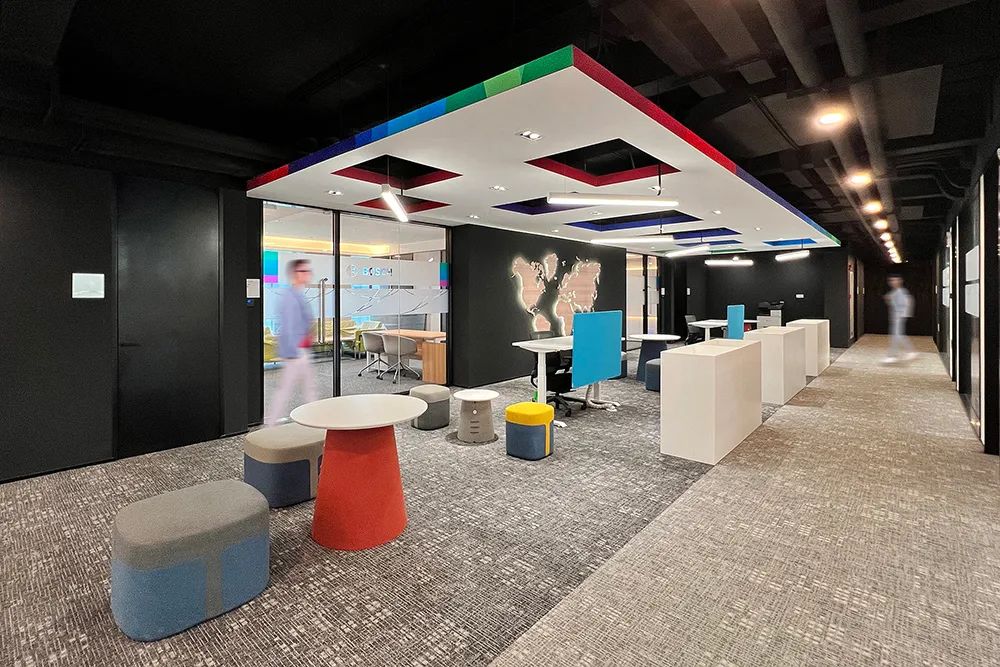 “我们拆掉了 12 面实体墙,用玻璃隔断和模块化办公家具重构了 80% 的空间。”项目建筑师介绍道。在开放式工作区,悬挑式白色天花板下悬挂着带彩色边缘的方形灯具,下方对应排列着可升降办公桌,员工可根据需求自由组合成 2 人协作单元或 8 人项目组。这种“家具即空间”的设计,使办公人数在不改变硬装的情况下可弹性增减 30%。