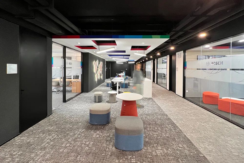 走进三楼总部办公区,首先映入眼帘的是渐变色彩办公家具与几何图案地毯的巧妙搭配。设计师将博世企业形象渐变调色板中的蓝、绿、橙三色,分别应用在会议椅扶手、休闲区沙发靠垫和开放式工位屏风上,形成流动的视觉引导。这种色彩策略并非随意为之——每个区域的家具配色都与天花板孔洞边缘的颜色相呼应,当员工从工位走向协作区时,视线会自然跟随色彩过渡,潜移默化中促进跨部门交流。