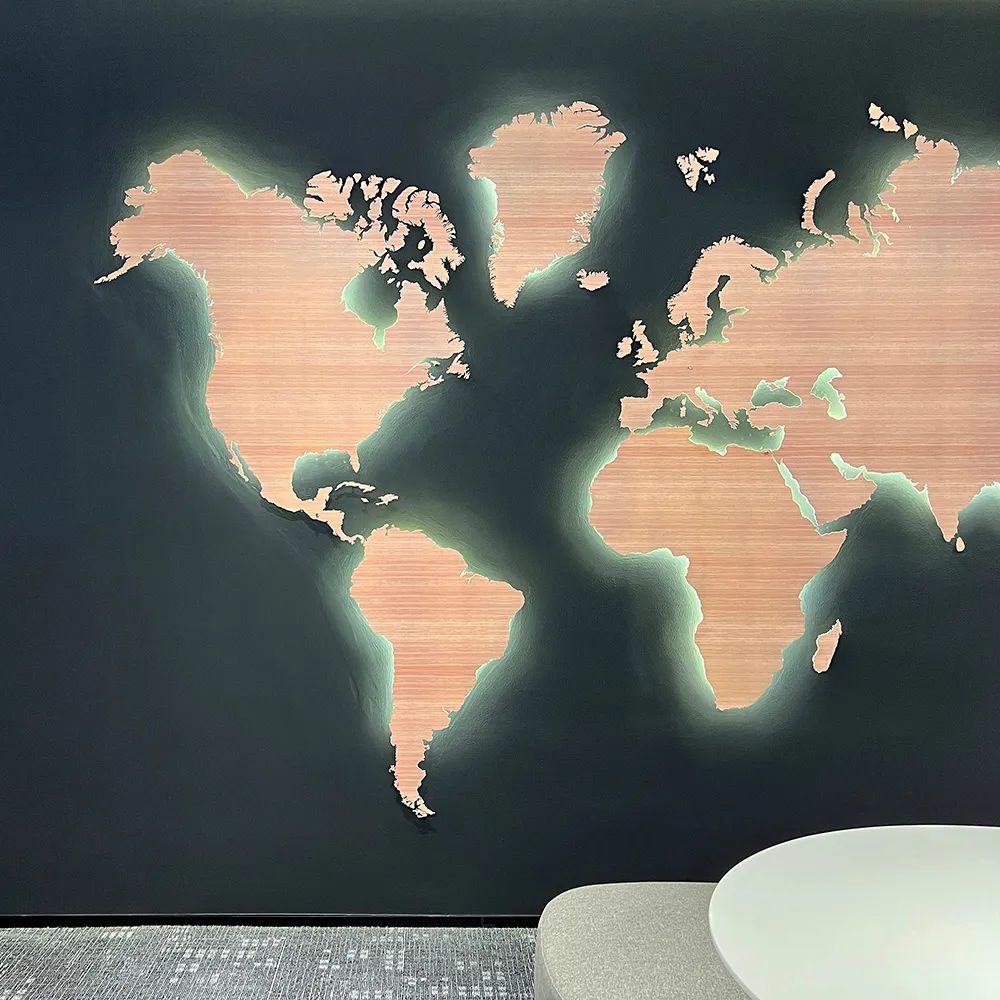 更令人叫绝的是磁吸式多功能墙板的设计。在员工入口处,一面覆盖博世渐变图案的磁吸板既是品牌展示墙,又是可更换内容的协作看板。而在领导办公室,同款灰度渐变图案被压缩比例后应用于墙面装饰板,与公共区域形成“分形流畅”的视觉关联,这种细节处理让整个空间既统一又富有层次。