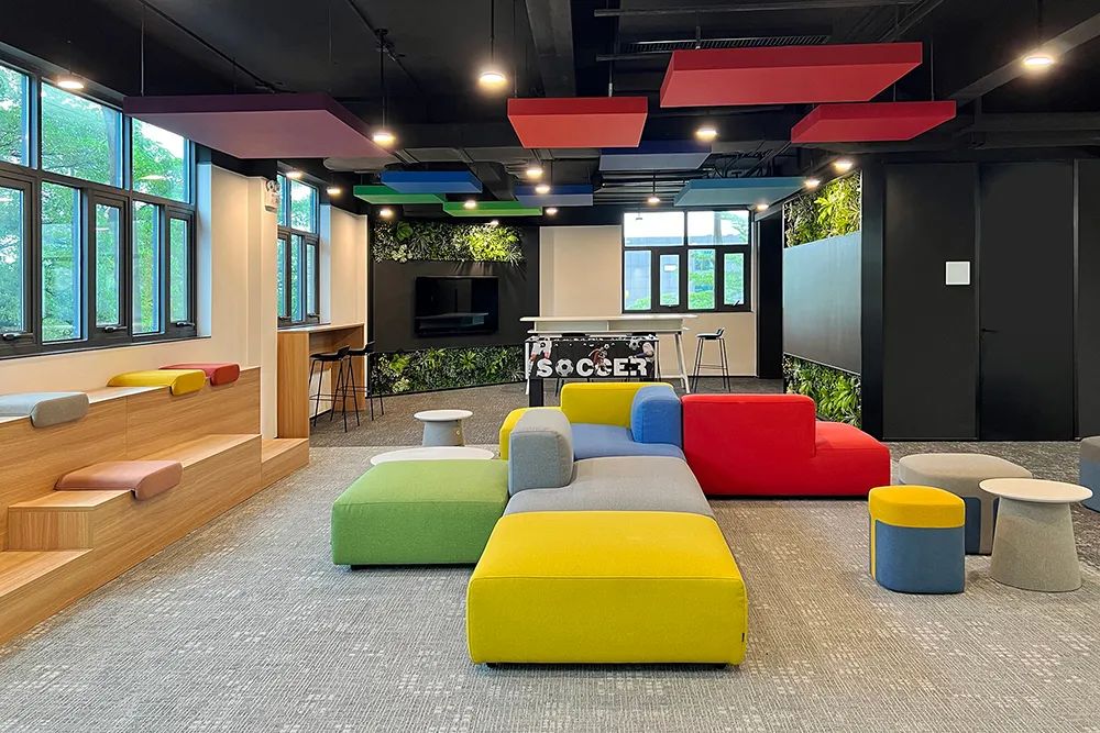 最惊艳的是绿植墙与声学家具的组合。在员工动线交汇处,一面 5 米高的垂直绿植墙不仅净化空气,其错落的植物排布还能分散噪音。搭配旁边的吸音布艺休闲椅,即使 20 人同时在此交流,背景噪音也能控制在 45 分贝以下。这种将生态美学与声学工程结合的设计,让办公环境既养眼又“养耳”。