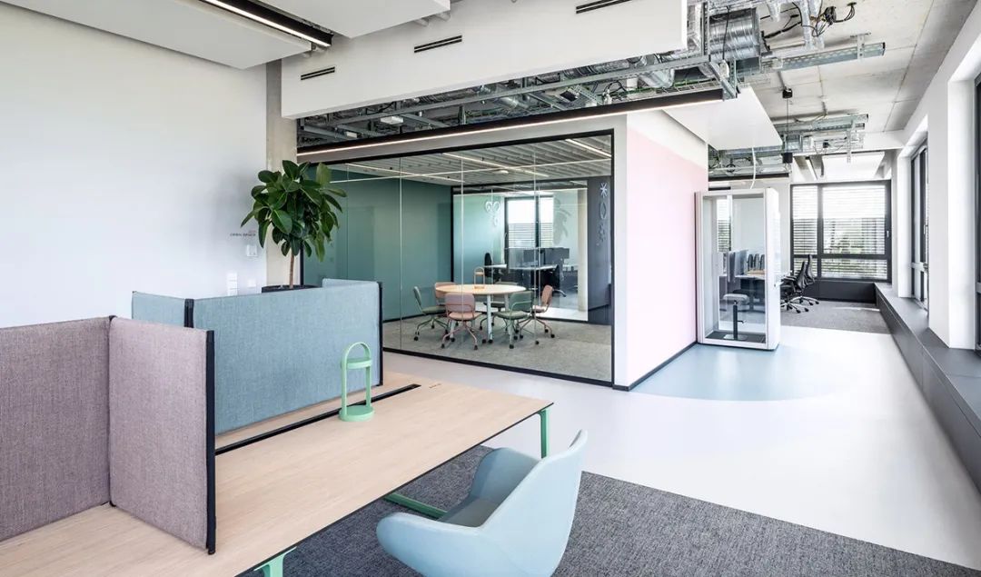 办公环境设计上,Sud设计团队用温柔粉彩与圆润线条中和科技的冷峻感。深浅不一的天然橡胶地板勾勒出流动的功能分区,可回收地毯为灵活办公空间注入温暖质感。原始混凝土天花板保留的工业质感,与圆形吸音筒、线性照明形成粗犷与精致的奇妙平衡,而模块化系统的应用让200个工作站能随团队规模自由重组。