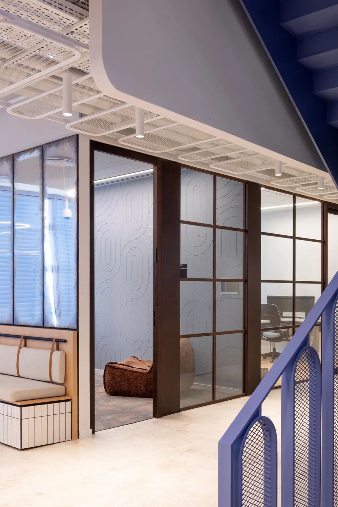 空间设计上,团队采用了极简主义的美学策略,以时尚工业风为基调,通过金属网的巧妙应用,在保证私密性的同时,营造出开敞明亮的视觉效果。这种材质的选择不仅呼应了汽车工业的机械美学,更通过光影的变化,为空间增添了动态的层次感。公共区域与工作区域的严格分隔,让设计师在公共空间的材料和照明选择上获得了更大的自由度,少量活泼元素的注入,与工作区的严肃氛围形成了恰到好处的平衡。