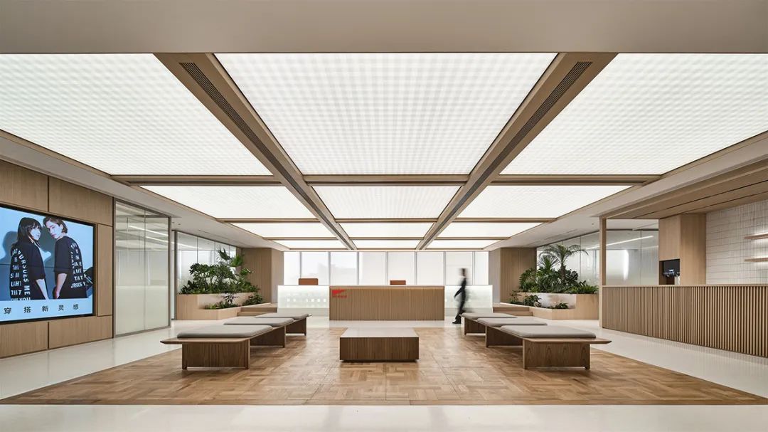 走进11层的主接待区,温暖的自然光透过落地窗洒入,木纹材质与“编织”纹理的图腾在墙面、地面与天花蔓延。这不仅是服饰品牌元素的转化,更隐喻着空间如何将人、光、景与品牌故事细致“编织”在一起。洽谈区微微抬升的地面,让人在舒适就坐的同时,也能平视整个空间,远眺城市天际线——一种不张扬却体贴的尊重。