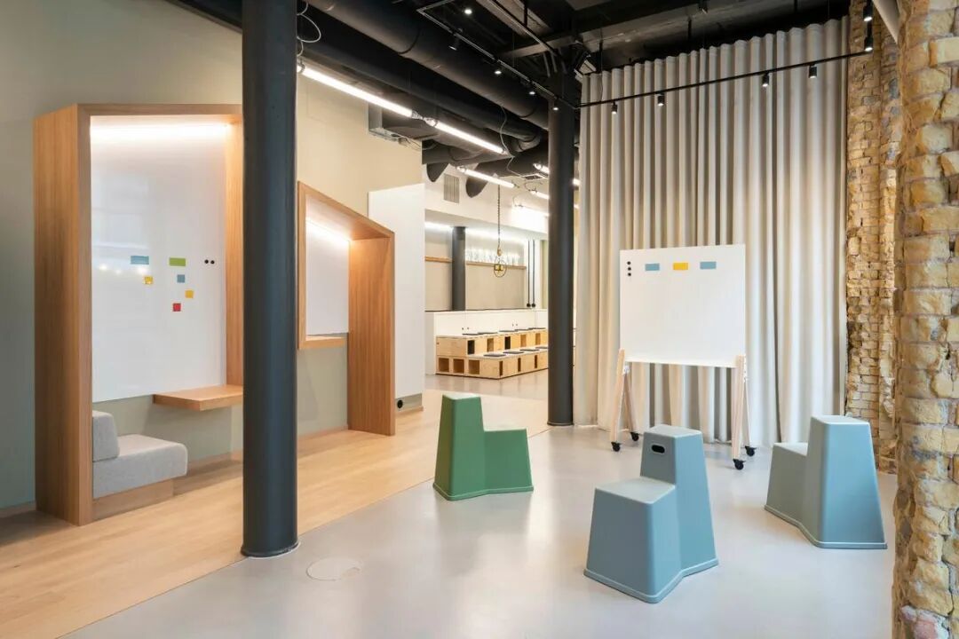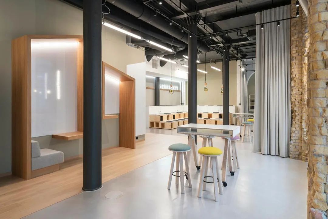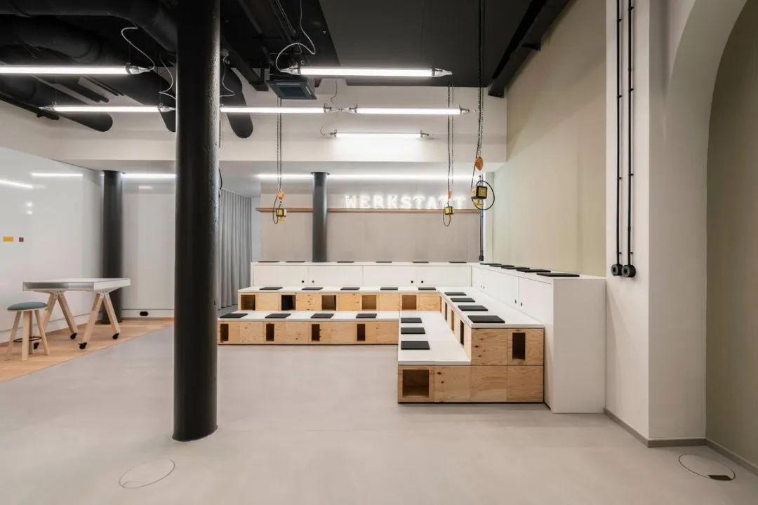空间位于一座始建于1903年的历史建筑内,原为韦特海姆百货公司的一部分,如今在保护与再利用的平衡中焕发新生。设计团队以“自由配置”为核心,打造出可根据工作行为自定义的灵活办公场景:从开放式厨房、休息区,到可容纳五人的“工作台”区域,再到阶梯式储藏与演讲空间,每一处都可随需重组。