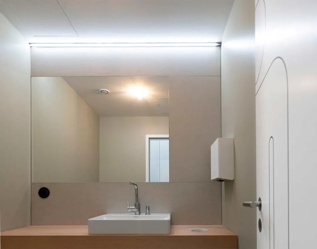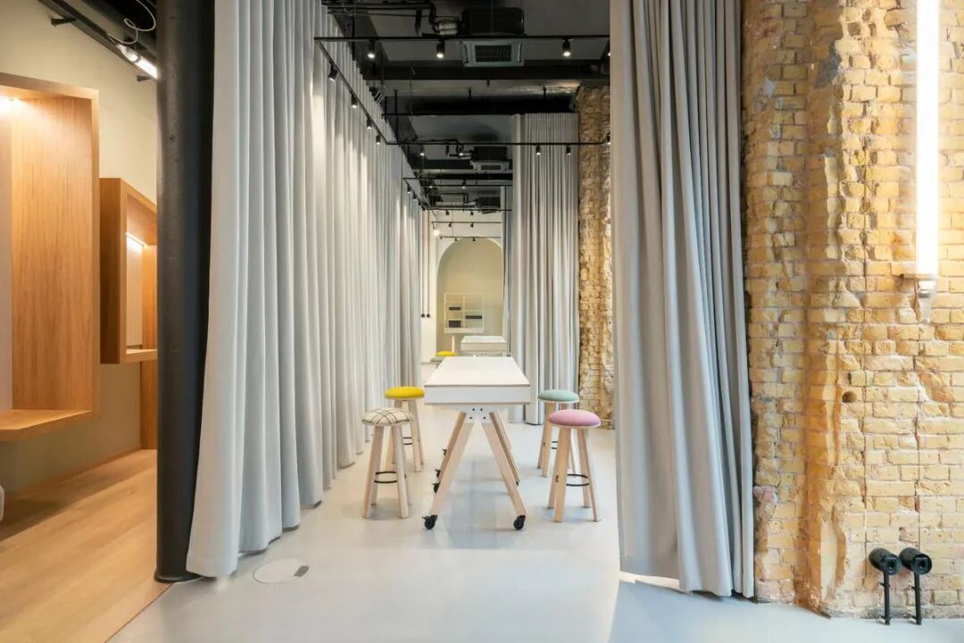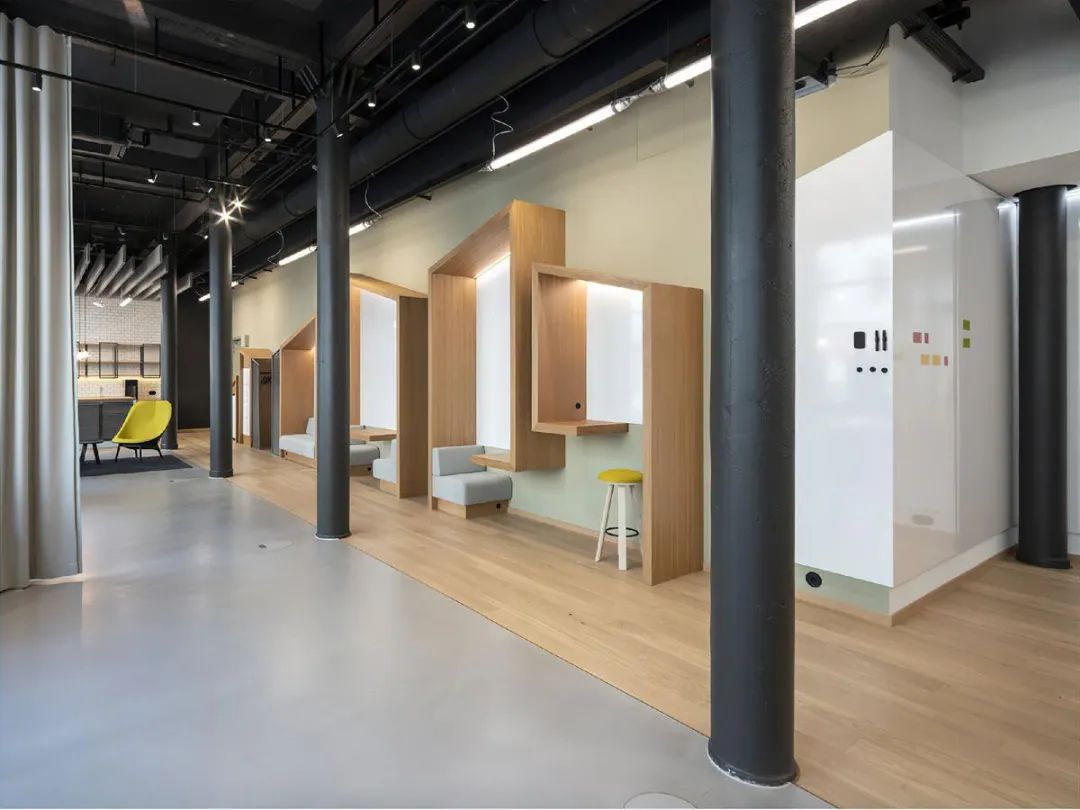 软装搭配与声学设计同样精巧。浅灰色高吸音窗帘不仅优化声学效果,还可灵活分隔空间;木丝挡板与三聚氰胺泡沫天花材料共同营造安静专注的工作氛围。整个空间既保留了历史建筑的肌理,又注入了现代办公的灵动与包容,成为德国保险行业中少见的创意办公样本。