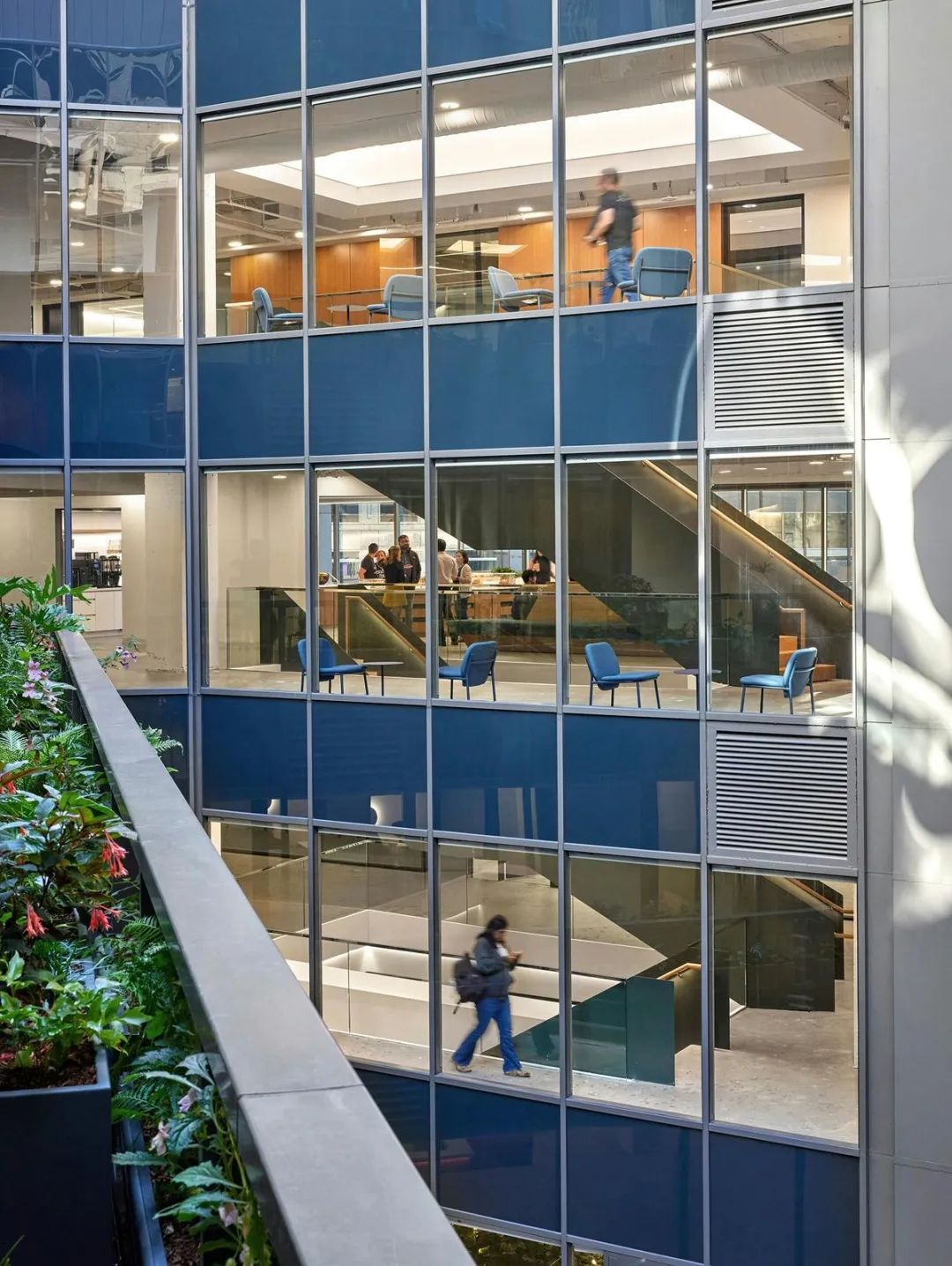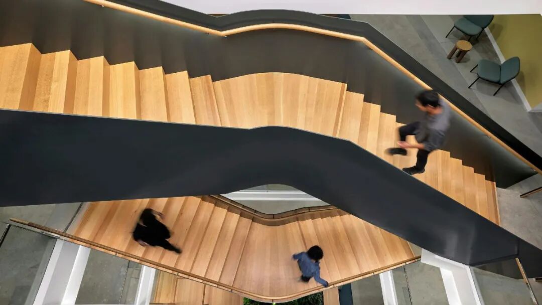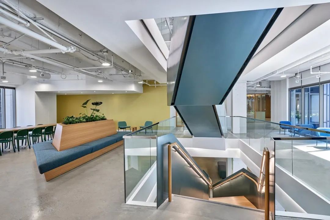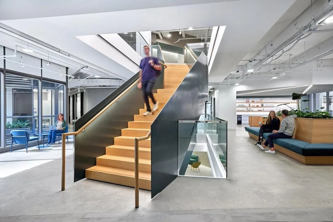 在办公环境设计方面,设计团队以大楼的中央庭院为核心,规划了一系列茶水间与社交区域,构建了一个连接所有员工的活力核心区。一道新建的雕塑感楼梯将多个楼层垂直连接,形成了独特的“垂直园区”。每个楼层都拥有和谐的色彩主题,为广阔的室内空间提供了视觉导向和独特身份。空间布局特别注重功能性,将三角形的端点区域设计为包含游戏室、阅读区及实践研讨空间等多元目的地,旨在促进员工聚集与不期而遇的交流。
