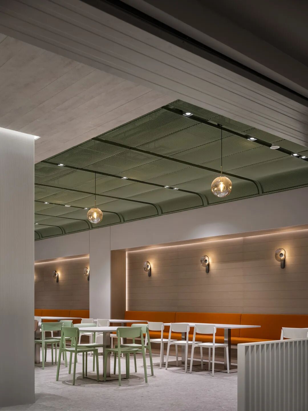 有序排列的顶面吸音垂片在走廊中提升声学设计,连接不同区域,确保办公环境简洁明亮。