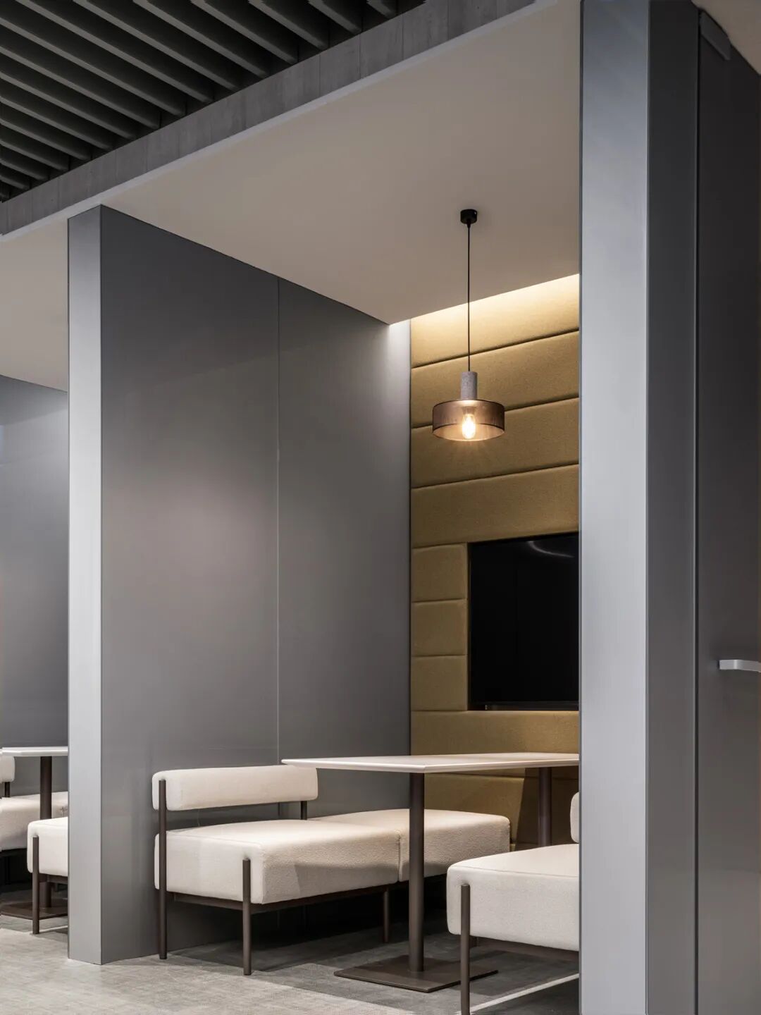 灰色背漆玻璃构成的“盒子”单元,结合柔软面料家具和低饱和度色彩,体现定制家具的延展性。圆形金属吊灯强化工业风格,而水吧嵌套设计展示色彩变换,满足共享与私密需求。