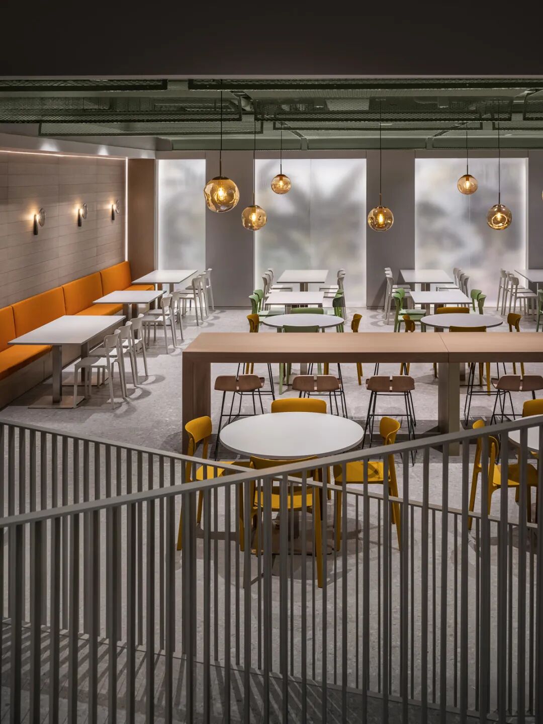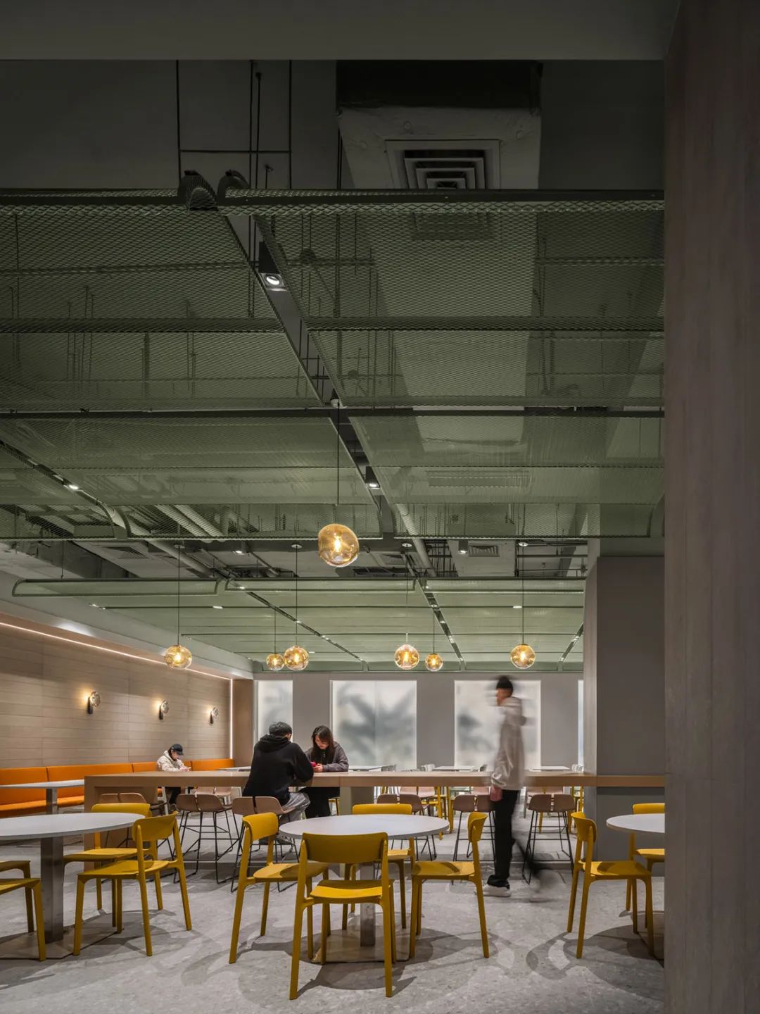 员工餐厅以绿色和黄橙色调营造舒适就餐氛围,卡座、吧台等办公家具多样化设计容纳不同需求。健身空间以灰度与蓝紫调激发健康生活联想,齐全设备满足职场人身心需求,体现办公环境设计的全方位考量。