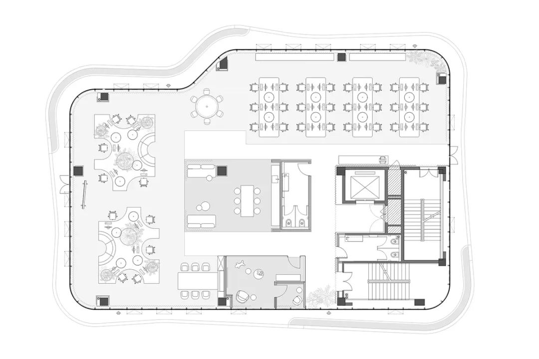 五楼以“树干”设计象征管理层对员工的关怀,定制家具如中央聚集区座椅,体现了人性化办公环境设计。这一空间强调社区感,使办公家具不仅功能实用,更传递企业价值观。