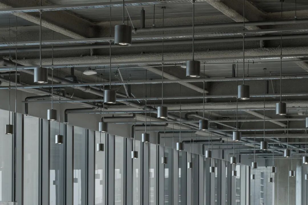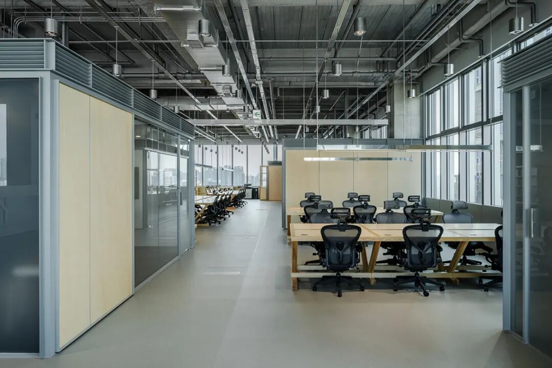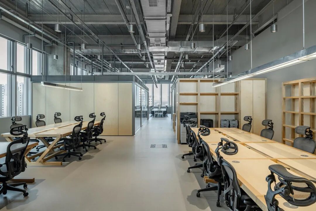 踏入办公室,首先映入眼帘的是由400盏银色吊灯与金属网格架构成的系统化loft天花,营造出通透利落的工业风视觉冲击。然而,与顶部硬朗线条形成鲜明对比的,是地面活动区大量使用的**定制办公家具**。设计师精选自然肌理的原木色家具,配合木质饰面包裹的功能盒子,打破了工业风的冷峻,注入了温暖惬意的氛围。这些**定制办公家具**不仅是功能的载体,更是光影的画布。白昼时分,阳光透过玻璃幕墙洒入,在木质表面形成变幻的光影韵律;夜幕降临时,暖色灯光在木饰面与金属之间流转折射,整个空间弥漫着令人安适的温润质感。这种**办公环境设计**充分体现了对员工包容与福祉的关注,让办公空间成为令人流连的日常场景。