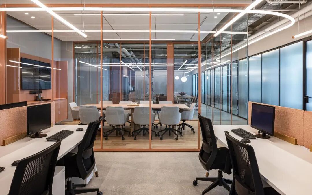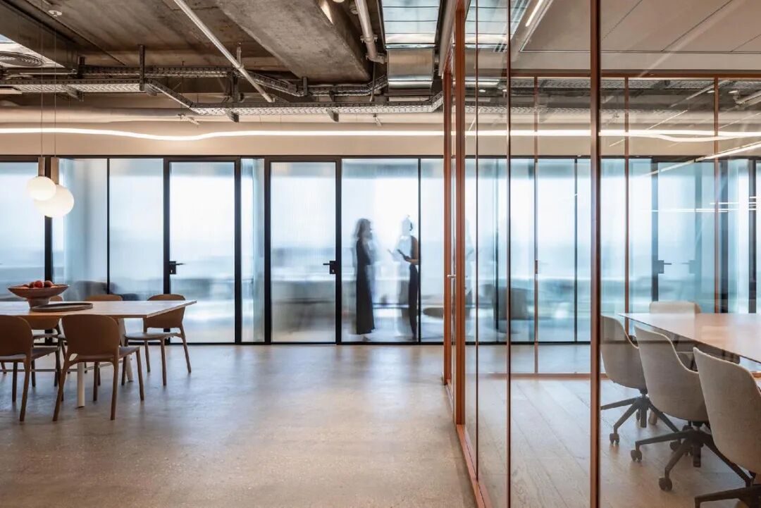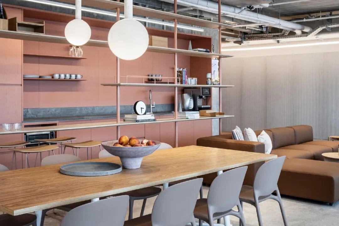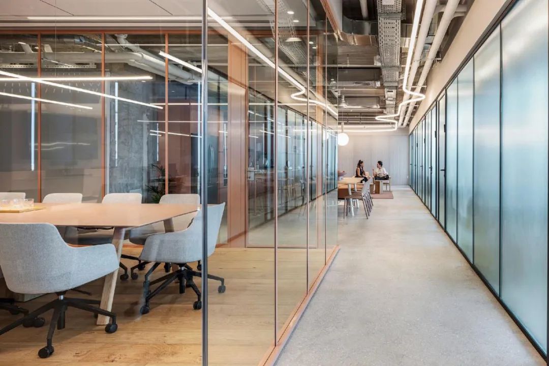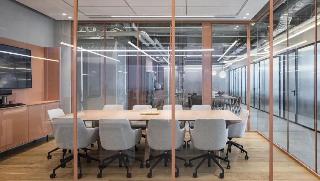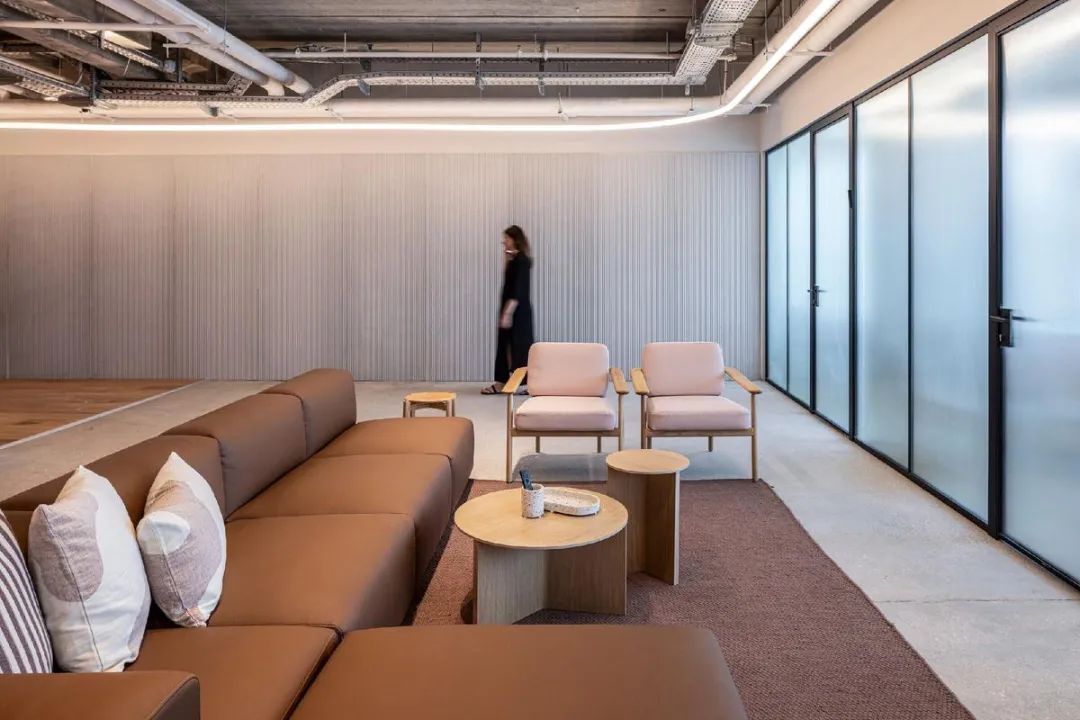 本案中,定制办公家具成为空间节奏感与视觉层次的重要组成部分。设计通过精心选择的家具、木工与材料,营造出既休闲又精致的氛围。玻璃隔断、条纹饰面墙与可调节照明装置相辅相成,赋予空间动感与灵活性,体现了办公家具在塑造企业文化与工作方式中的核心价值。