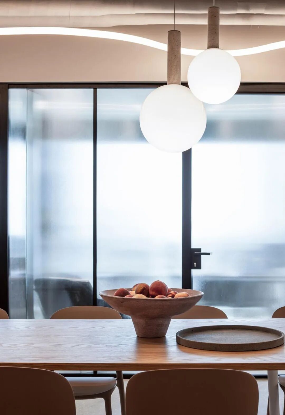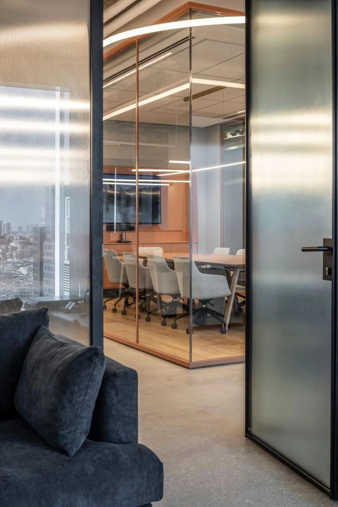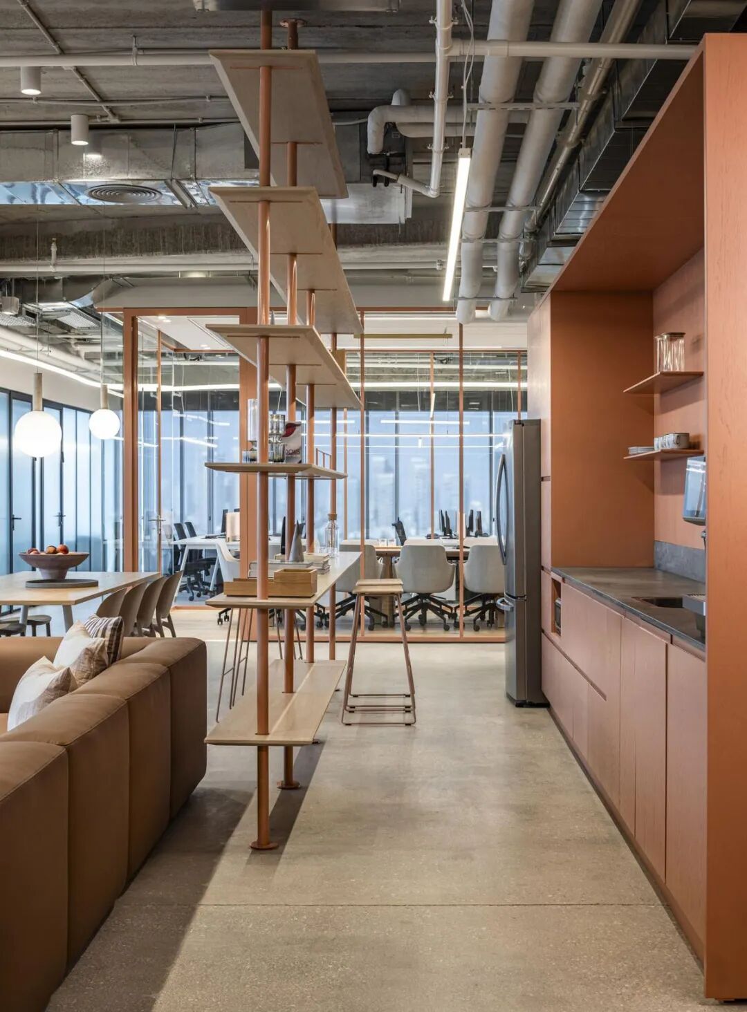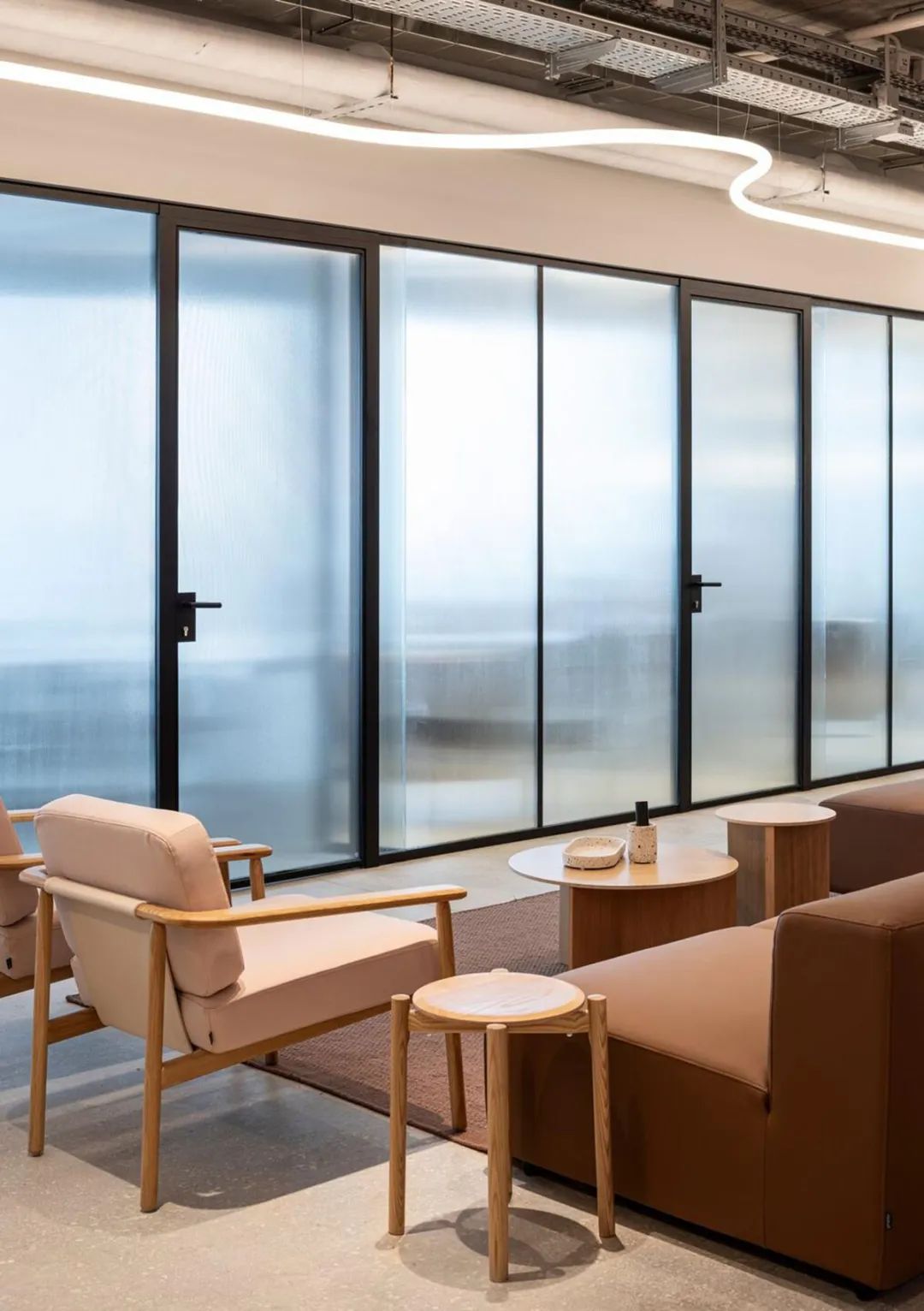 本案中,定制办公家具成为空间节奏感与视觉层次的重要组成部分。设计通过精心选择的家具、木工与材料,营造出既休闲又精致的氛围。玻璃隔断、条纹饰面墙与可调节照明装置相辅相成,赋予空间动感与灵活性,体现了办公家具在塑造企业文化与工作方式中的核心价值。
