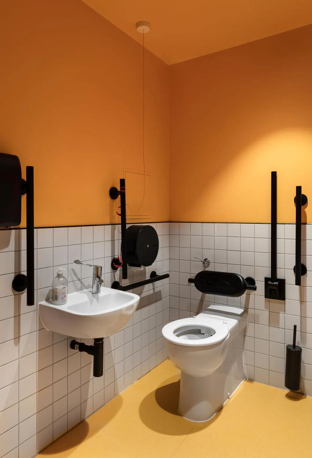 灵活性是本案的另一大亮点。为满足日间作为传统咖啡馆、夜间支持校园活动需求,空间布局采用“固定+移动”的组合策略:沿墙设置固定家具,中央区域配置可轻便推移的定制沙发与可堆叠桌椅,空间可快速切换为鸡尾酒会等社交活动场景。配套的商业厨房支持24小时独立运营,使该空间成为校园内全天候活跃的交流节点。