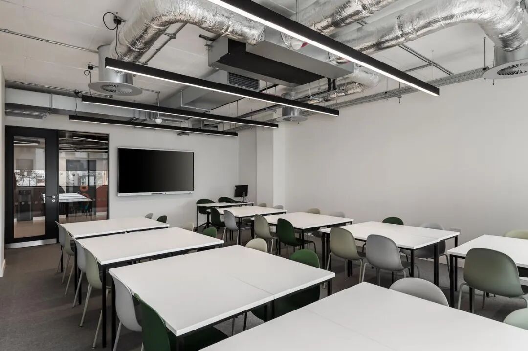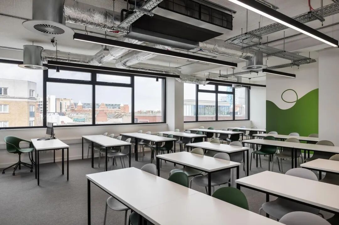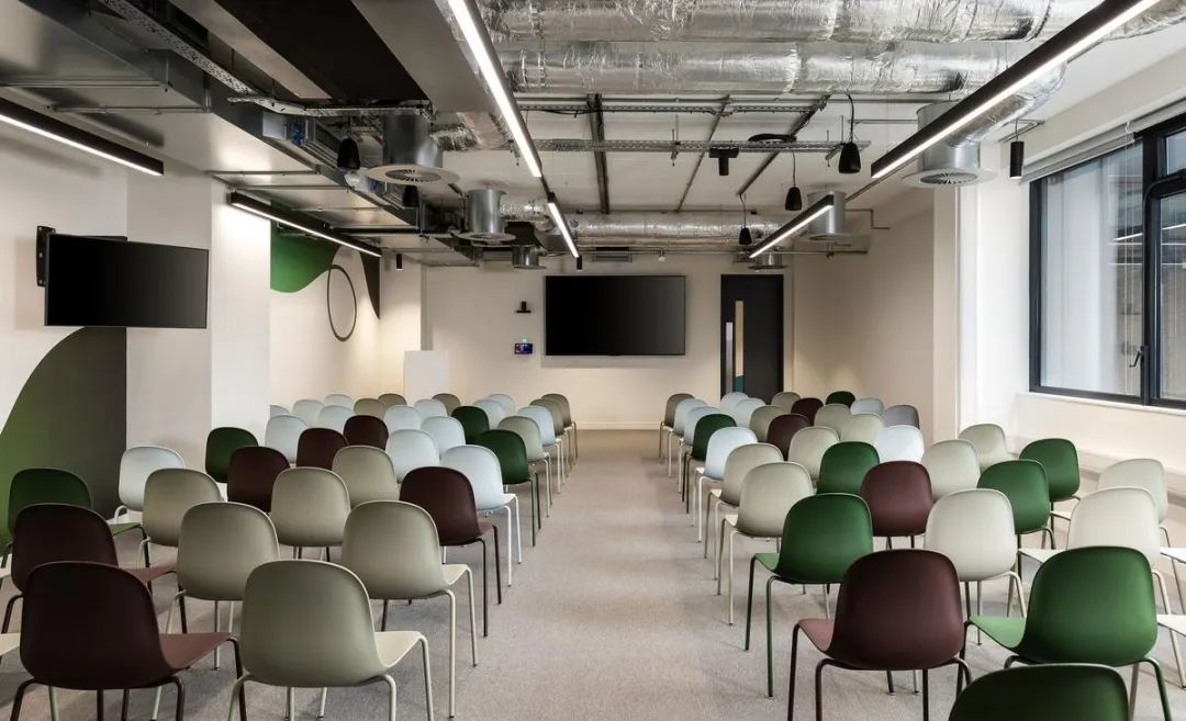 本次改造涵盖多个功能区域:配备先进设施的演讲厅、两间可灵活分隔的会议室、一个可从日间咖啡馆模式转换为晚间活动模式的灵活多元空间,以及一处连接皇后大道北端的校园阶梯式露台景观。