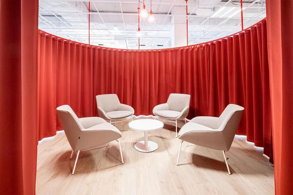 可复制经验:用移动隔断取代固定墙体,用高靠背沙发和共创站替代封闭会议室