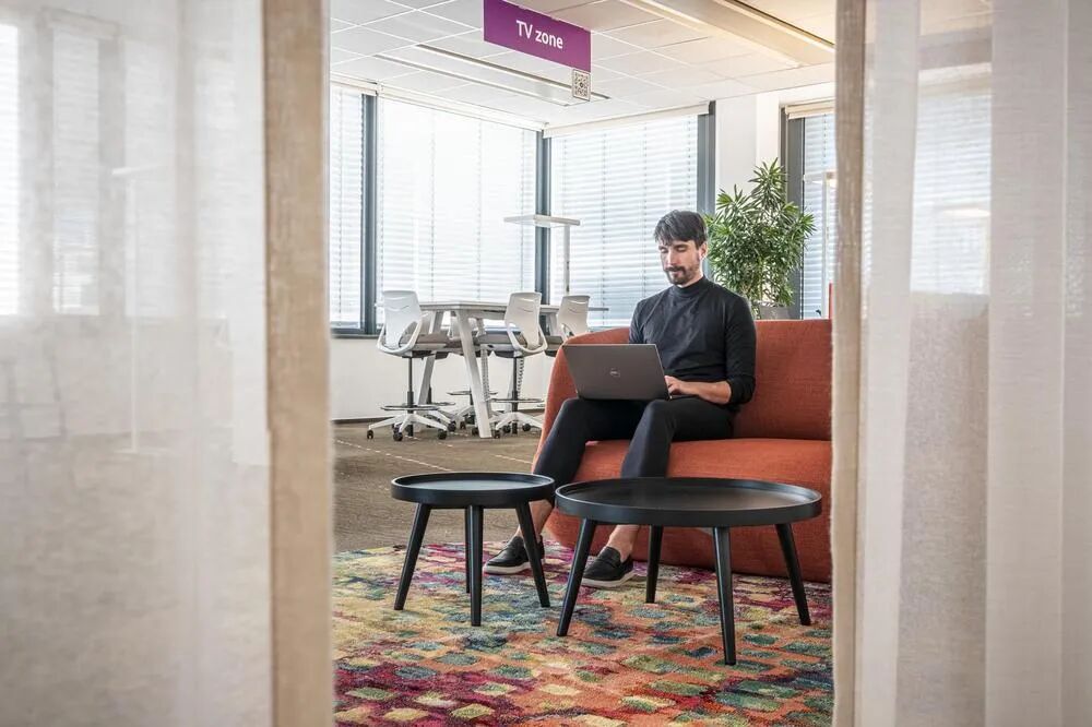 通讯行业办公室如何兼顾灵活性与幸福感?2,500平方米零建筑改造,办公家具与色彩玩出新高度