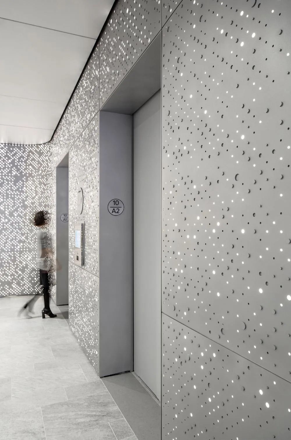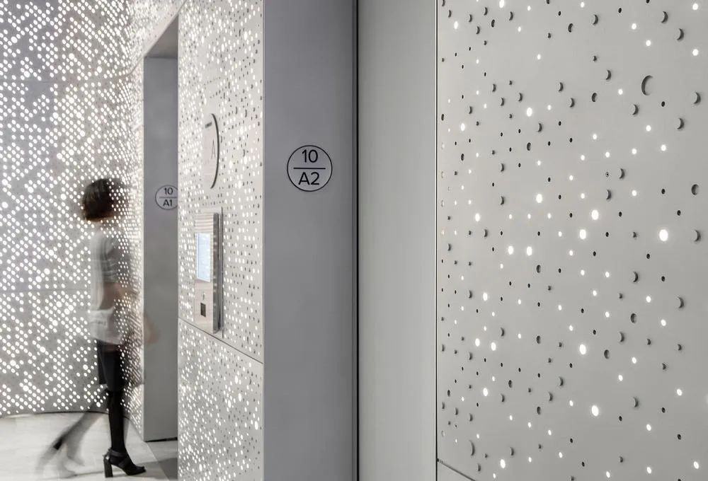 访客由10层进入——这是总部4至14层的中心楼层。一出电梯,便是由定制三维冲孔铝板打造的星空般闪烁大厅,非凡的视觉冲击为金融服务行业办公室设计奠定高端基调。