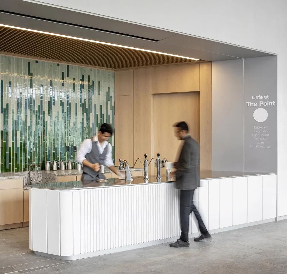 传统的接待台被取消,取而代之的是一个专属定制的交互式数字桌面——PointBar。这不仅是一个接待点,更是员工与访客自由查阅公司文化、历史的互动中心。这种设计充分体现了办公家具定制在功能与美学上的双重价值。